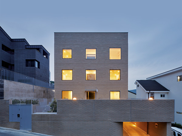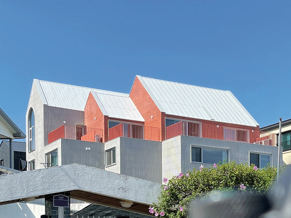 분가 후 흩어졌던 가족들이 한 동네에 다시 모였다.한 지붕 아래 세 가족으로, 따로 또 같이 찾아가는 새로운 삶의 형태와동네를 향해 짓는 건축물의 표정을 만난다.(위, 아래) 진입 가벽과 돌출형 베란다, 다락 외장재 등으로 인해 각도에 따라 다른 질감을 보여주는 주택. 상단부의 맨 앞은 콘크리트 재질을 따라가되, 뒤로 이어지는 부분부터는 입구의 가벽과 같은 치장벽돌로 마감해 연속되는 느낌을 준다.HOUSE PLAN대지위치 ≫제주특별자치도 제주시 대지면적 ≫349㎡(105.75평) 건물규모 ≫지상 4층 + 다락 거주세대 ≫건축주 1세대(부부 + 자녀 3), 임대 4세대 건축면적 ≫209.47㎡(63.36평) 연면적 ≫532.99㎡(161.23평) 건폐율 ≫59.92% 용적률 ≫152.46% 주차대수 ≫6대 최고높이 ≫15.13m 구조 ≫기초 – 철근콘크리트 매트기초 / 지상 –철근콘크리트 단열재 ≫THK 비드법 보온판 2종 1호 외부마감재 ≫외벽 - 벽돌(모던타일 화이트) 위 발수코팅 / 지붕 - THK 0.5 컬러강판(백색) 내부마감재 ≫벽 - 벤자민무어 친환경 도장 / 바닥 - 구정마루(원목마루), 마모륨 욕실·주방타일 ≫윤현상재 수입타일 수전·욕실기기 ≫아메리칸스탠다드, 대림바스 주방 가구·붙박이장 ≫제작가구(디자인허브) 조명 ≫을지로 모던라이팅조명 계단재·난간 ≫라왕 계단판 / 금속 평철난간 현관문 ≫시공사 현장제작 방문 ≫ 영림도어, MDF + 필름지 부착 데크재 ≫㈜건화목재 이페 19㎜ 창호재 ≫이건창호 에너지원 ≫LPG 조경 ≫듀송플레이스 전기·기계 ≫지엠이엠씨 설비 ≫㈜지엠엔지니어링 구조설계(내진) ≫㈜한길구조엔지니어링 시공 ≫이아컴퍼니 총공사비 ≫10억 5천만원(설계비 및 인테리어, 조경 및 토목공사 미포함) 설계·감리 ≫㈜요앞건축사사무소 070-7558-2524https://yoap.kr(위, 아래) 필로티 공간의 답답함을 희석시키기 위해 삼각 기둥과 작은 자갈 정원으로 꾸몄다. 비정형의 대지 형태와 어우러지도록 기둥의 배치 또한 점선으로 곡면을 그리듯 이어진다.가벽에서부터 시작되어 1층 상업공간과 구별되는 진입로. 그림자가 지듯 반복되는 아치 모양이 인상적이다.비교적 최근에 신축된 계획도시 중심에 위치한 대지는 다가구 원룸부터 식당, 편의점, 카페 등 비교적 평범한 도시의 골목 풍경을 가지고 있었다. 건축주와 가족들은 구도심에서 오랜 기간 거주하다 이 골목에서 형제 가족들까지 다 같이 모여살 수 있는 공동주택을 계획했다.상업공간의 입구는 양문형으로 구분되지만, 색의 통일과 길처럼 이어진 타일로 인해 위화감은 없다.주거공간 입구는 포인트 컬러와 함께 독특한 입체감으로 눈에 띈다. 독특한 입면 속에 함께 구성한 우편함이 포인트가 된다.계단실의 밑공간에 조명을 두어 모래 정원을 연출했다. 콩자갈과 함께 어우러져 독특한 공간감을 가지는 장소다.단독주택이 아닌 만큼 공동의 발길이 닿는 주차장이나 계단실이 필수적이고 주된 공간이 되어야 하기에, 디자인적으로 더욱 많은 고민과 투자를 했다. 지나칠 수 있는 공동의 디테일이 견고해야만 공간에 애정이 더해질 수 있기 때문이다. 세 가족과, 이어 만나게 될 임대세대 모두의 라이프스타일을 고민한 주거 형태는 각각의 세대를 교차시키고 포개는 형태로 완성했다.2층 세대의 가족서재는 단을 올려 한 쪽으로만 출입구를 냈다. 앉은키에 맞춰 낸 창문이 공간 전체를 햇살로 채운다.거실에서 바라본 부엌의 모습. 집 안 곳곳에도 아치형 문이 포인트로 자리잡고 있다. 화이트 톤의 아일랜드로 주방을, 바닥과 비슷한 우드 톤으로 다이닝 공간을 함께 연출했다.거실 천장을 노출 콘크리트로 오픈함과 동시에 테두리처럼 단 간접 조명이 독특한 공간감을 준다.SECTION또 다른 고민은 부지의 형태로 인한 진입공간 조성에서 시작됐다. 크기 자체는 넉넉하지만 도로를 좁게 면한 부채꼴 모양의 부지. 차량 진입과 보행진입로를 포함하면 남는 폭이 거의 없을 정도로 입구가 좁은 대지였기에 불가피하게 주택의 입구가 필로티의 안쪽까지 들어갈 수 밖에 없었다. 이에 따라 어둡지 않고 기분 좋은 진입 공간에 대해 깊이 고민했다. 상업 공간을 지나쳐 들어가는 주거 공간 입구에 여러 디자인적 요소로 입체감을 줬다. 특히 붉은색 치장 벽돌로 마감한 진입 가벽은 상단부의 외장재와 이어지며 건축물이 동네를 향해 짓는 표정을 완성시킨다. 필지 여건상 불가피한 부분을 위트를 담아 건물의 캐릭터로 살려낸 예시로 꼽을 만하다.계단실 사이공간에서 바라본 후면창.4층 세대 거실. 콘크리트의 질감과 박공지붕의 선을 함께 살려 독특한 공간감을 가진다.거실에서 쪽문을 통해 비밀공간처럼 이어지는 테라스. 작은 포치와 조명으로 살린 디테일이 돋보인다.① 근린생활시설 ② 지상주차장 ③ 다목적실 ④ 서재 ⑤ 침실 ⑥ 테라스 ⑦ 거실 ⑧ 부엌 ⑨ 세탁실 ⑩ 화장실 ⑪ 다락 ⑫ 물탱크실 ⑬ 현관건축가 정상경, 류인근, 김도란“최적의 필지 찾기만이 해답은 아닙니다.”대지를 선정할 때에 기본적으로 접도조건, 대지 규모, 형태 및 지역지구 등을 가장 먼저 생각하죠. 도로는 4m 이상의 도로를 북측으로 면하되 길게 면하는 게 일반적으로 더 유리합니다. 또 필지는 직사각형이 좋은 