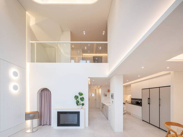 사는 이의 가치관과 삶의 흔적이 고스란히 기록되는 공간, 집. 깨끗한 도화지 같은 바탕에 곡선과 은은한 조명이 어우러져 따스한 분위기를 낸다.사랑스러운 두 딸과 엄마, 아빠가 함께 따스한 일상을 만들어가는 새 보금자리. 1층과 2층, 다락으로 구성된 타운하우스 주택은 가족의 삶과 취향을 담아 보드랍고 포근한 공간을 이룬다. 1층에는 주방과 다이닝, 거실, 욕실, 아이방이, 2층에는 갤러리 같은 소거실과 안방, 욕실과 드레스룸, 작은방이 놓였다. 다락으로 오르면 나지막한 박공지붕의 놀이 공간, 넉넉한 수납공간과 테라스가 자리한다. 구조 변경은 거의 없었지만 군더더기 없는 새하얀 여백에 곡선과 간접 조명, 생활을 고려한 편의 요소들이 더해진, 가족에게 꼭 맞춘 집이다.현관에서 거실로 이어지는 복도를 따라 주방과 다이닝룸, 계단실과 욕실이 있다.복도의 회색 벽면은 핑크 톤 욕실이 대비를 이루며 포인트가 되어준다. 곡면 처리한 코너 덕분에 동선이 자연스럽다.널찍한 아일랜드 키친은 대리석 패턴의 박판 타일로 마감했다. 주방을 지나 집 모양 창을 낸 문이 있는 곳이 아이방이다.안으로 들어와 가장 먼저 마주하게 되는 현관은 이 집의 축소판과도 같다. 흰색이지만 따뜻한 톤의 마감재와 신발장이 있는 아치문, 천장의 곡면 디테일 등이 인테리어 콘셉트를 함축적으로 보여준다. 중문을 열고 곡면의 코너를 자연스럽게 돌아서면 긴 복도를 따라 널찍한 주방이 나타난다. 맞은편의 회색 벽면은 마이너스 메지로 면을 분할해 단조롭게 느껴지지 않도록 했으며, 분할된 면에 맞게 계획된 문 뒤로 핑크빛 욕실이 숨어 있다.화이트&우드 조합의 다이닝룸. 벽에 원형 매립 선반을 만들어 취향에 따른 디스플레이 연출이 가능하다.주방에서 연결되는 세탁실. 넉넉한 수납이 가능한 팬트리가 숨어있는 곳이기도 하다.주방에는 요리를 좋아하는 엄마의 특별 요청으로 2,800×1,100(mm) 크기의 아일랜드 키친을 만들고, 대형 박판 타일을 적용해 이음매 없이 매끈하게 마감했다. 널찍한 아일랜드가 장 본 물건들을 정리하기에도 편리하다고. 이어지는 동선의 다이닝은 우드와 화이트가 어우러진 심플한 공간으로, 벽에 원형의 무늬목 매립 선반을 배치해 카페 같은 분위기를 물씬 풍긴다.시원한 공간감의 거실. 아트월 좌측 코너를 곡면으로 처리해 커튼을 걷었을 때 숨길 수 있는 커튼 박스를 만들었다.POINTPOINT 1_현관 신발장내부 디자인을 함축적으로 보여주는 현관. 밖으로는 벤치형 수납장만 하나 두고, 아치형 출입구에 미닫이문을 설치하여 숨은 신발장을 마련했다.POINT 2_자매를 위한 벙커룸놀이방으로 활용할 아이방은 계단과 사다리가 있는 벙커룸으로 구성했다. 복층 공간은 퀸사이즈 매트리스 크기를 기준으로 하여 침대로도 쓸 수 있다.POINT 3_다락 테라스집 안에 머무는 시간이 많은 요즘, 더욱 소중해진 다락 테라스에는 개방감 있는 폴딩도어를 설치했다. 마당을 대신해줄 프라이빗한 야외 공간이다.거실은 이 집의 하이라이트. 무려 5.3m에 달하는 천장고의 시원한 공간감을 자랑한다. 리모델링을 맡은 그루아키텍츠는 이 개방감을 극대화하기 위해 기존 몰딩과 단차를 정리해 미니멀한 벽면과 천장을 완성했다. 곡선 디자인의 천장 간접 조명에서는 빛이 부드럽게 퍼지고, 시원하게 트인 전면 창에는 싱그러운 바깥 풍경이 가득 담긴다. 아트월 창가 측에는 커튼을 걷어 숨길 수 있는 곡면 벽을 만들어 자연스럽게 커튼 박스를 만들어주었다. 창문 맞은편 벽면은 테라코트 슈퍼화인으로 마감하여 벽면에 노을빛이 비칠 때, 밤에는 업라이트 간접 조명을 받을 때 특유의 텍스처가 살아난다.하나의 방 안에서도 다양한 공간을 넘나들며 재미있게 놀 수 있는 아이방. 자매를 위한 아지트가 되어줄 벙커룸이다.벙커 계단 하부는 옷장과 선반을 만들어 활용했다. 방문에 낸 창은 부모가 아이들이 놀이하는 모습을 언제든 확인할 수 있게 해준다.자매의 놀이방으로 사용되는 아이방은 거실 반대편 끝에 자리한다. 벙커룸, 박공지붕 출입구, 계단과 사다리 등 다양한 공간 요소가 모여 있어 키즈 카페 못지않은 곳이다. 벙커룸 2층 공간에서 아이들은 크고 작게 열린 창 너머로 다양한 시선을 경험할 수 있으며, 간접 조명을 설치해 천장고를 최대한 확보하고 눈부심을 예방하는 배려도 잊지 않았다. 특히 퀸사이즈 매트리스 크기에 맞춰 디자인, 제작하여 아직 어린 아이들이 좀 더 자라면 방을 분리해 침대로 활용할 수 있게 한 점이 인상적이다.INTERIOR SOURCE대지위치 ≫경기도 김포시 거주인원 ≫4명(부부 + 자녀 2) 연면적 ≫226.46㎡(68.50평, 다락 및 테라스 65㎡ 포함) 내부마감재 ≫벽 - 벤자민무어 스카프엑스, 테라코 테라코트 슈퍼화인 스프레이 / 바닥 - 세림세라믹 수입 포세린 타일, 구정마루 스웨디시화이트(셰브런), 구정마루 브러쉬 골드 티크스카치(셰브런) / 천장 - 벤자민무어 울트라스펙 욕실 및 주방 타일 ≫세림세라믹 수입타일 수전 등 욕실기기 ≫더죤테크, 아메리칸스탠다드, 퓨로 양변기, 세면대·수건장 –자체 제작 주방 가구 ≫자체 제작(살리체 하드웨어, 리얼스톤 빅슬랩 타일 상판), 한스그로헤 