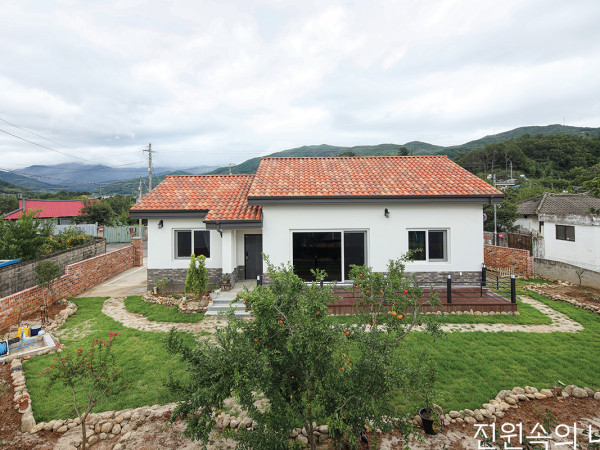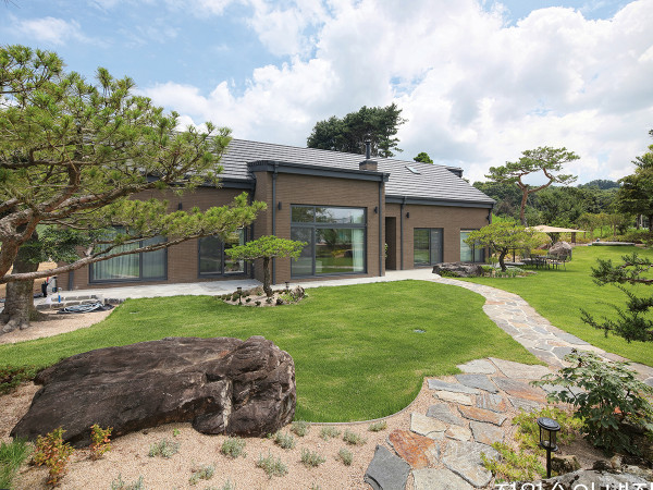 초등학생 자녀 셋을 둔 젊은 부부는 1년여의 준비 끝에 주택살이를 시작했다. 당장에 요긴한 집보다, 오래오래 살 수 있는 단층의 중목구조 주택이 그들의 선택이었다.ELEVATION전원주택이라고 하면 대개 산과 호수 옆의 호젓한 집을 떠올린다. 반면, 단독주택은 도심 내 택지지구 안에 자리한 신식 주택을 말하곤 한다. 최근에는 이 둘의 접점이라 볼 수 있는, 소도심 외곽 주택들이 많아지고 있다. 편의 시설은 지척에 있으면서 자연과도 가까운 환경. 지방의 작은 도시에 사는 젊은 부부들이 아이를 위해 과감히 주택 건축에 도전하고 있기 때문이다.충북 음성군 감곡의 한 마을. 주변에 신축 아파트들을 끼고, 근사한 생활체육공원을 코앞에 둔 땅에 세 채의 집이 들어서고 있다. 두 채는 이미 입주를 완료했고, 한 채는 건축이 진행 중이다. 가족끼리 합심해 땅을 개발하고 필지를 나누어 집을 지었는데, 도로면의 담을 하나로 만들어 일종의 작은 단지주택 같은 이미지를 갖는다.집의 외관은 최대한 단순화해 하자 발생 요소를 줄였다. 빗물은 후레싱을 타고 땅 속 배관으로 바로 흐르게 해 집의 외관이 한결 깔끔하다.비정형의 자연석으로 진입로를 만들고 곡선의 구획들로 마당을 조성했다. 심플한 선의 주택과 대비되는 효과를 낸다.오래 전부터 모아둔 거대한 자연석들은 출입구 정원 곳곳에 포인트가 된다.대지 경사를 활용해 만든 차고, 대문과 자연석 계단을 통해 마당으로 오르면 시원하게 펼쳐진 정원을 만난다. 1천m2에 달하는 대지는 완만한 경사로 재미를 준 잔디마당과 빼어난 수목, 야외 테라스가 한데 어우러져 눈을 즐겁게 한다. 건축에 대한 준비가 1년이었다면, 조경에 대한 준비는 10년 전부터 이루어졌다. 좋은 나무와 멋진 조경석을 만나면, 한 장소에 모아두면서 미래의 정원을 꿈꿔왔다. 덕분에 마당에는 고목이라 칭할 법한 향나무와 느티나무가 큰 그늘을 만들어 주고, 평상을 대신할 만큼 너른 바위가 휴식처가 된다. 건축주는 온종일 마당을 뛰노는 막내아들을 보면 그동안 쏟았던 열정과 시간이 아깝지 않다고 말한다. 일주일에 한 번 오는 잔디 깎는 시간도 즐거운 일상이 되었다고.집은 두꺼운 목재를 짜맞춤 형식으로 지은 중목구조다. 과하지 않은 설계와 합리적인 건축비 등을 고려해 내린 선택이다. 무엇보다 가족은 시멘트집을 벗어나고자 하는 바람이 있었다. 노출되는 거대한 목재 보를 통해 나무가 주는 경쾌하고 자연스러운 분위기를 온전히 만끽하고자 했다. 아직 어린 아이들이 있는 집이지만, 2층을 포기하고 심플한 단층을 택한 것도 의외다. 여기에는 평생 살고 싶은 집에 대한 염원이 있었다. 아이들이 장성해 집을 떠나도 부부가 여생을 보내기에 불편하지 않은 집이어야 했다. 다행히 대지가 넓어 충분한 1층 면적을 확보할 수 있었고, 거실 부위는 층고를 높여 개방감을 주고 아이들에게는 다락을 선물해 2층의 아쉬움을 달랬다.HOUSE PLAN대지위치≫ 충청북도 음성군 대지면적≫ 1,000m2(303평) 건물규모≫ 지상 1층 + 다락 건축면적≫ 176m2(53.33평) | 연면적≫ 176m2(53.33평, 다락 73m2) 거주인원≫ 부부 + 자녀 3 건폐율≫ 17.6% | 용적률≫ 17.6% 주차대수≫ 2대 최고높이≫ 7.3m 구조≫ 기초 - 콘크리트 매트기초, 지상 - 105×105 글루램 중목구조 단열재≫ 크나우프 에코필, 크나우프 24K 유리섬유, 락울 외부마감재≫ 벽 - 삼한C1 점토벽돌 / 지붕 - 모니어 점토기와(평기와) 담장재≫ 자연석 창호재≫ 이플러스윈도우 알루미늄 시스템창호(3중로이) 철물하드웨어≫ 스테키코리아 중목철물 에너지원≫ LPG 조경≫ 건축주 자체 조경 설계≫ ㈜세담주택건설 + 음성건축사사무소 시공≫ ㈜세담주택건설 031-679-0660www.sedam.co.kr총공사비≫ 4억5천만 원(가구, 조경 제외)보조주방 겸 세탁실.부부 침실에 딸린 욕실.마당으로 바로 나갈 수 있는 발코니창을 낸 침실.부부 침실과 자녀방 세 개는 모두 남쪽에 위치한다. 거의 비슷한 면적으로 나누고, 모두 앞마당으로 발코니창을 내어 바로 흙을 밟을 수 있게 했다. 북쪽으로는 방을 제외한 부엌, 다용도실, 욕실, 계단실, 드레스룸을 배치해 주택은 좌우로 긴 동선을 갖는다. 집의 중심인 거실과 주방은 오픈형이지만, 다이닝룸은 좀 더 특별한 공간으로 꾸몄다. 거실과 분리하는 낮은 벽을 세우고, 아치형 개구부를 제작했다. 나무를 덧댄 박공 형태의 천장이 아늑한 분위기를 강조한다.인테리어는 전적으로 부부의 소신을 따랐다. 싱크대나 신발장 등 제작가구는 직접 업체를 수소문해 주문하고, 바닥재와 타일 등 모든 소재와 컬러도 스스로 택했다. 일련의 과정이 힘들기도 했지만, 실력 있는 시공팀을 만나 후회 없이 진행했다. 유행에 휩쓸리는 디자인 대신 보편적인 실용성을 최우선에 뒀기에, 집도 인테리어도 뚝심 있게 완성할 수 있었다.중목구조의 글루램이 노출되어 목가적인 분위기를 내는 자녀방. 아이 셋을 위해 각 방의 크기도 동일하게 배치했다.수납실 겸 아이들의 놀이방, 부부의 취미실로 사용하는 다락방. 지붕은 단열성능이 좋은 기와로 마감하고 웜루프 방식으로 시공되어 실내가 쾌적하다.INTERIOR SOURCE내부마감재≫ 페인트 도장 욕실 및 주방 타일≫