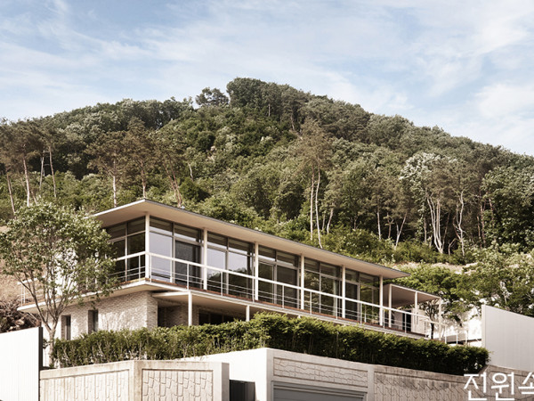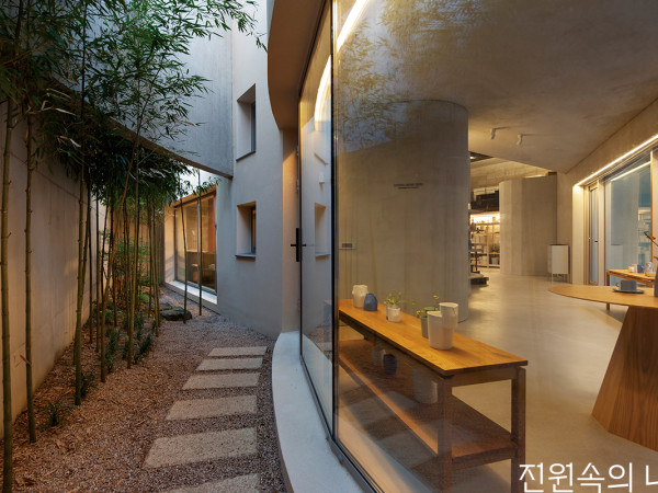 옮기는 걸음마다 중첩된 풍경 사이로 자연을 느낄 수 있는 곳. 높이차가 큰 경사지 위 지어진, 도예가 부부의 집과 작업실이다.오랜 시간 독일에서 생활하며 작업을 하다 돌아온 작가 부부. 두 사람은 부모님과 함께 거주할, 작업실 겸 주택을 건축하기로 하고 사무소를 찾아왔다. 정말 여러 건축사무소와 상담을 하였다는 그들의 이야기에서 집에 대한 소중한 이상과 바람을 느낄 수 있었고, 인연이 닿는다면 더욱 마음을 써야겠다고 속으로 생각했던 듯하다. 그렇게 감사한 인연이 되어 같은 곳을 바라보며, 같은 마음으로 건축의 태어남을 이끌었다.도예 작업을 하는 건축주 부부 내외는 예술가로서 그들의 삶과 작업이 적절히 분리되어 있되, 또 한편 자연스럽게 연결되어 흐르길 원했다. 4m 이상의 높이차가 심한 경사지 특성상 지하를 활용하여 스튜디오 겸 쇼룸을, 지상층은 주거층을 두자는 계획이었다. 다만 스튜디오 공간과 주거공간은 심리적으로 분리감과 전이성을 느낄 수 있는 분명한 변화가 계획된, 차별화된 공간이길 바랐다.내부 동선은 서로 연결되어 있으며, 외부에서는 지하층과 지상층 각각 분리된 진입 동선이 이루어져야 했다. 따라서 지하층은 땅의 흐름을 읽어내고 해석하여 자연스럽게 주차공간과 스튜디오, 쇼룸이 연결된 동선으로 배치되었고 건축의 진입을 이끌고 시퀀스를 부여하도록 계획되었다. 그 모습은 자연과 동화된 땅으로부터의 건축을 이야기하며, 단순한 기하학이 아니라 주변 풍경에 순응하여 자신의 존재를 드러내는 의미를 지닌다.위에서 내려다본 주택의 전경. 부유하는 나선형 계단과 축벽의 중첩이 다양하고 새로운 풍경의 전개를 이끌어 색다른 건축적 경험을 선사한다.크고 작은 창의 배치 디자인이 ㄷ자 형태의 중정을 품은 주택 후면에도 그대로 이어진다.경사지인 대지는 물리적 환경상 건축설계에 난이도를 부여한다. 동시에 평탄화된 대지에서는 표현되기 어려운 차별화된 시퀀스와 독창성을 자연스럽게 제공하는 단초가 되어준다. 설계할 때 쉽고 예측이 가능한 디자인보다 이토록 다양한 변수와 해석이 가능한 조건의 디자인이 오히려 매력적인 것은, 여전히 이 일에 대한 열정으로 가득 차 있기 때문이 아닐까.SECTION1층 현관으로 이어지는 계단. 거친 물성의 노출콘크리트는 대지의 흙을 상징하는 재료다.지하 주차장과 스튜디오&쇼룸의 진입부. 공중에 떠 있는 나선형 계단과 건축물 사이 열린 하늘로 비와 바람, 빛이 내려앉는다.도예 작가 부부의 지하 쇼룸. 창밖, 곡선으로 잘려 오픈된 옹벽의 틈은 계단의 조형미와 어우러져 여백의 풍경이 된다. 이는 건축주의 도예 작품 콘셉트를 형상화한 표현이기도 하다.HOUSE PLAN대지위치 ≫경기도 용인시 수지구 대지면적 ≫375㎡(113.44평) 건물규모 ≫지하 1층, 지상 2층 거주인원 ≫4명(부모님 + 부부) 건축면적 ≫74.91㎡(22.66평) 연면적 ≫282.75㎡(85.53평) 건폐율 ≫19.98%(법정 20%) 용적률 ≫39.95%(법정 80%) 주차대수 ≫2대 최고높이 ≫10.15m 구조 ≫기초 - 철근콘크리트 매트기초 / 지상 - 철근콘크리트 단열재 ≫벽 - 비드법보온판 2종2호 180T / 최상층 천장 - 압출법보온판 1호 220T 외부마감재 ≫벽 - 노출콘크리트 위 발수 코팅 + 스터코 아쿠아솔(미국산) / 지붕 및 두겁 - 0.7T 알루미늄 징크 담장재 ≫산석 쌓기, 조경석 쌓기, 에메랄드그린 + 대나무 식재 창호재 ≫공간시스템 알루미늄 단열창호 97mm AL, 35mm 로이 3중유리 열회수환기장치 ≫말레이(독일제) 벽부형 에너지원 ≫LPG 조경석 ≫자연석(발파석) 조경 ≫조경상회(시공 - 주원조경), 한아름조경 전기·기계·설비 ≫㈜덕수이엔지 구조설계(내진) ≫SDM구조기술사사무소 설계 ≫아키텍츠601 시공 ≫아키텍츠601 × 제이아키브건폐율이 20%밖에 되지 않는 대지 조건을 활용해 지하층을 최대로 계획하고 작은 볼륨의 지상층을 감싸 안는 듯한 형상의 유기적인 곡선의 형태를 만들어냈다. 그것은 건축적 조형미로서의 의미도 갖지만, 건축주인 작가 부부의 도예 작업에서 받은 영감이 크게 작용했다. 단순함 가운데 한국적인 선의 흐름, 중첩의 미학이 현대적인 감성으로 완결된 도예 작품이 건축의 표상이 되어 본 주택의 정신으로서 담긴 것이다. 또한, 작은 볼륨의 지상층 주거공간은 공간과 공간 사이에 켜의 볼륨인 ‘중정’을 삽입했다. 덕분에 내부와 외부가 자연스럽게 흘러 답답하지 않은 자연에 머무르는 풍경으로 거주자를 인도한다.대나무 정원의 차경이 정서적 평온함을 안겨주는 스튜디오 내부. 지상층인 주거공간으로 향하는 진입 계단은 쇼룸과 스튜디오의 경계 사이 좁고 긴 동선으로 공간의 전이가 이루어지도록 계획되었다.중첩, 틈, 선, 켜 등의 디자인 언어들이 전시 작품과 긴밀히 호흡하는 쇼룸 전경. 작품이 지닌 감각적이고 동양적인 선과 색이 콘크리트의 미감, 원목의 온기와 어우러져 아늑하고 정적인 분위기를 이룬다.구조는 기초와 지상층 모두 콘크리트 구조로 계획되었으며, 인접한 산과 환경적 영향으로부터 내밀성, 내구성을 더해주도록 설계되었다. 외장재는 훨씬 안정적인 자정 성능을 자랑하는 ‘아쿠아솔’이라는 미국산 스터코 제품을 선택해 유지