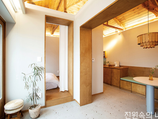 평범한 일상 속 새로운 경험을 만들어주는 마음 한구석에 남을 장소. 집을 짓기 전 가볼 만한 숙소, 그 일곱 번째는 강원도 강릉의 오래된 동네 안에 문을 연 ‘늘, 교동’이다.요즘 강릉여행은 교동에서 시작한다. 터미널과 마트 등 편의시설이 가까운 오래된 주거 지역. 이곳에서 짐을 풀고 오죽헌을 들렀다 경포대나 송정해수욕장에서 발을 적신다. 돌아오는 길에는 동네의 아기자기한 식당과 디저트 숍에서 음식을 포장한다. 그날 하루만은, 진짜 내 집인 것 같은 느낌으로 숙소의 문을 열면 여행의 클라이막스가 시작된다.스테이 ‘늘, 교동’은 1970년대 지어진 작은 집을 리모델링한 곳이다. 올 2월 오픈 이후, 매일 새로운 집주인을 맞고 있다. 진짜 주인은 인근에서 디저트 카페를 운영하는 파티시에. 그녀는 언니 둘과 힘을 합쳐 이 집을 찾아내고 옛 분위기를 최대한 담아 집을 고쳤다. 유럽 여행을 하며 만났던 숙소를 떠올리며 트렌디한 공간보다는 구옥의 고즈넉함에 집중했다.한정된 대지에 크지 않은 집이기에 공간 활용이 가장 중요했다. 외부에 있던 구식 화장실도 실내로 옮기고 침실과 주방, 다이닝룸 등이 모두 포함된 그림을 그려야했다. 실내 개조에 앞서 외벽과 지붕을 동네 분위기에 맞춰 새롭게 도장하고, 점방이 있던 공간에 유리블록으로 벽을 쌓았다. 세월의 흔적이 담긴 툇마루는 그대로 두어 작은 마당을 감상하는 벤치이자 집으로 들어서는 출입구 역할을 하도록 했다.입구로 들어서면 가장 먼저 만나는 다이닝룸.침실은 입구 홀에서 들어와서 주방으로 바로 나갈 수 있도록 두 개의 출입구를 냈다.테라조 타일로 꾸민 감각적인 욕실.HOUSE PLAN대지위치 ≫ 강원도 강릉시 교동 대지면적 ≫ 71m2(21.47평) | 건물규모 ≫ 지상 1층 건축면적 ≫ 38.22m2(11.56평) | 연면적 ≫ 38.22m2(11.56평) 건폐율 ≫ 54% | 용적률 ≫ 54% 외부마감재 ≫ 외벽 : 외부용 수성 페인트 도장 / 지붕 : 기존 금속기와 위 우레탄 도장 / 대문 : 금속 제작 위 우레탄 도장 내부마감재 ≫ 벽 : 수성 페인트 친환경 도장 / 바닥 : 포세린 타일 / 천장 : 미송 루버 위 우드스테인 도장 욕실 및 주방 타일 ≫ 포세린 타일, 모자이크 타일(재승세라믹) 수전 등 욕실기기 ≫ 토토, 더죤테크, 아메리칸스탠다드(대일도기사) 주방 가구 ≫ 자작나무 합판 위 우드스테인 도장 조명 ≫ 제작 조명, 수입 조명 직구, T5 간접등(LED보급소) 현관문 ≫ 라왕 원목 위 우드스테인 도장, 복층유리, 무늬유리 방문 ≫ 자작나무 합판 위 우드스테인 도장 데크재 ≫ 방킬라이 위 우드스테인 도장 조경석 ≫ 파쇄석 시공 ≫ 건축주 직영 설계·감리 ≫ 심은정(스튜디오 심은)주방에서 취사는 불가지만 토스터기, 전자레인지, 커피머신은 물론 다양하고 특색 있는 식기류를 갖춰 충분히 멋진 플레이팅이 가능하다.구옥의 모습을 그대로 간직한 외관. 목재 프레임의 미닫이문과 툇마루, 디딤돌이 정겹다.PLAN ① 현관 ② 거실 ③ 주방&다이닝룸 ④ 방 ⑤ 욕실 ⑥ 테라스 ⑦ 파우더룸실내는 정면으로 다이닝룸, 왼편으로 침실, 오른편으로 파우더룸이 자리한다. 벽면은 흔히 쓰는 하얀 벽지 대신 옅은 회색의 페인트를 칠하고 천장의 목재 서까래는 그대로 유지했다. 옛집인데 보기 드물게 층고가 높아 색다른 공간감을 준다. 내부 가구는 서까래에 맞춰 대부분 나무로 제작했고, 테라조 타일을 매칭해 이 집만의 색깔을 낸다. 여기에 그린을 포인트로 주방과 화장실 내부를 스타일링했다. 침실에서는 파우더룸과 주방으로 각기 향하는 다른 통로가 있고, 주방은 또 작은 테라스와 바로 이어진다. 투명한 지붕 아래 좌식 공간을 마련해 야외 분위기를 한껏 즐길 수 있게 했다.날이 좋은 날에 햇볕을 가득 받고, 비 오는 날은 빗소리의 운치를 담는 집. 늘, 교동을 다녀간 이들이 공통적으로 전하는 후기가 있다. 강릉해변과 맛집을 포기할 만큼 이 집은 계속 머물고 싶은 곳이라고. 돌아다니기보다 머무는 여행이 필요한 이들에겐, 정말 매력적인 스테이다.벽과 지붕은 동네 경관에 맞춰 새로 도장하고, 코너에는 유리블록을 시공해 채광을 좋게 했다.파우더룸에는 유리블록을 통해 하루종일 햇빛이 가득히 들어온다.INTERVIEW 장은해 대표소개를 부탁합니다 늘, 교동은 세 자매가 함께 꾸려가고 있어요. 첫째는 마케팅 분야에서 오래 일했고, 둘째는 대학에서 영어를 가르쳐요. 저는 막내로 교동에서 디저트 카페를 운영하고 있죠. 제가 대표 타이틀은 갖고 있지만, 함께 공간을 찾고 꾸민 곳이기에 늘 세 자매의 집이라고 생각하고 있어요.구옥을 고쳐 스테이를 만들게 된 계기는 르꼬르동블루 제과 코스를 마치고 호텔과 유명 케이크점에서 실무를 쌓았어요. 저만의 디저트점을 오픈하고자 강릉을 찾았지요. 가게를 열면서 서울의 가족들이 강릉에 오면 머무를 장소가 필요하겠다고 생각했어요. 강릉을 자주 다니면서 조금만 손보면 멋지게 변신할 수 있는 구옥이 많다는 걸 알게 됐고, 이렇게 연을 맺게 되었죠.집의 콘셉트는 무엇인가요 늘, 교동은 ‘늘’이라는 단어가 주는 편안함, 그리고 한결같음을 담고 있어요. 저희 자매들은 유행에 민감하지 않고, 오히려 늘 비슷한 패턴을 추구하는 편