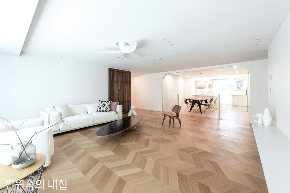 채광 좋은 거실은 깨끗한 화이트 바탕에 쉐브론 패턴의 마루가 어우러져 따스한 분위기를 낸다.