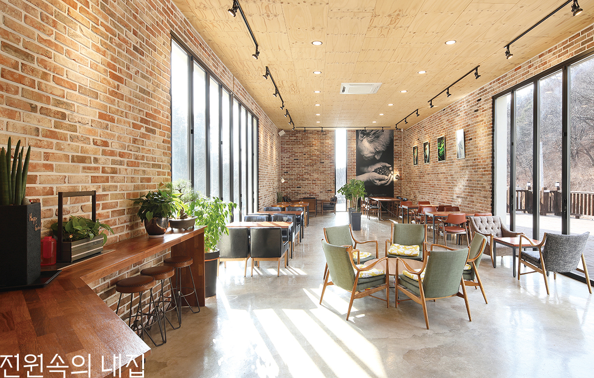 카페 인테리어는 목재와 파벽돌로 아늑함을 살렸다.