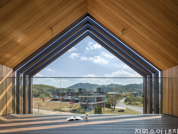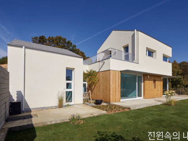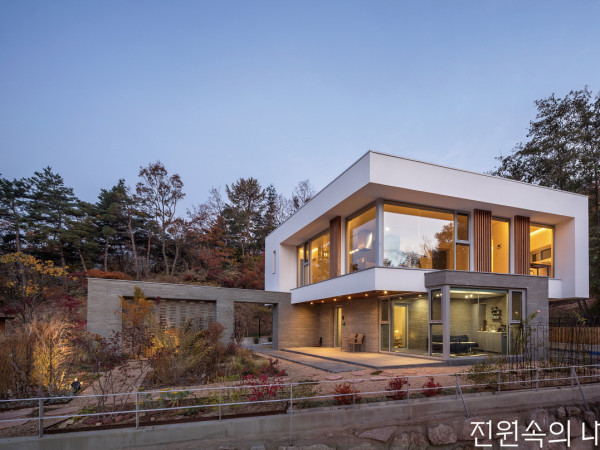 영천 윤택한家아름다운 풍경과 정원을 더해 부부의 4도3촌 꿈을 이뤄준 선물 같은 집. 자연을 마주하고 느끼는 하루하루는 자녀들의 성장을 보는 것만큼이나 행복하고 경이로운 일이었다.별빛마을로 잘 알려진 경상북도 영천시 화북면 보현산 자락. 주택이 자리 잡은 이 땅은 클라이언트가 무려 2년여 동안 대구 근교의 주택지를 찾아다니다 마지막에 홀린 듯이 계약한 곳이라고 한다. 그도 그럴 것이 주택지 뒤편으론 동산이 있어 대지 전체를 포근히 감싸주고 집 앞엔 아름다운 능선이 펼쳐져 자연을 제대로 만끽할 수 있으며, 종일 볕을 받아 아늑한 것은 물론 여러 채의 주택이 함께 어울려 살아가는 등 건축주가 바라는 모든 조건을 충족하는 곳이었다.메인 게이트를 지나 처음 만나게 되는 건물의 모습. 외벽에서 연장된 벽체는 진입 개구부를 제외하곤 벽 너머의 모습을 가리는 스크린 역할도 하여 다음 공간에 마련된 정원 풍경을 극대화하는 요소로 작용한다.앞마당 정원에서 건물을 바라본 모습정남향에 가까운 건물 배치로 인해 일출과 일몰 시간에 맞춰 앞마당 정원과 근사한 풍광을 감상할 수 있다.208평 대지면적에 30평 미만의 규모로 계획되는 만큼 주어진 주변 자연환경을 얼마나 잘 이해하고 활용하는가가 설계의 핵심이었다. 주말이나 휴가 기간에 이용할 목적으로 건축되는 세컨드하우스의 기능과 클라이언트의 은퇴 후 생활패턴을 고려할 때 일반적인 주거 형태의 기능과 차별화시킬 수 있는 입체적인 계획이 필요했다.햇살 가득한 낮 동안의 앞마당HOUSE PLAN대지위치≫ 경상북도 영천시대지면적≫ 689㎡(208.4평) │건물규모≫ 지상 2층 │거주인원≫ 2명(부부)건축면적≫ 76.40㎡(23.11평) │연면적≫ 99.11㎡(29.98평)건폐율≫ 11.09% │용적률≫ 14.38% │주차대수≫ 1대 │최고높이≫ 6.88m구조≫ 기초 – 철근콘크리트 매트기초 / 지상 – 철근콘크리트단열재≫ 압출법보온판 가등급 135mm외부마감재≫ 스터코플렉스 외단열시스템, 두라스택 큐블록담장재≫ 평철 + 방킬라이 │창호재≫ 필로브 시스템창호 │에너지원≫ LPG조경석≫ 서영산업 │조경≫ 엘리그린앤플랜트 김원희 │전기≫ 우진 E&C기계·설비≫ 모든 E&C │토목≫ 동진측량 │구조설계(내진)≫ SM구조시공≫ 건축주 직영(SHnT) │실시 및 인허가≫ 아토건축사사무소설계≫ YSH & ASSOCIATES(와이에스에이치 앤 어소시에이츠)SECTION① 현관 ② 계단실 ③ 화장실 ④ 데크 ⑤ 창고 ⑥ 거실 ⑦ 침실 ⑧ 주방 ⑨ 욕실 ⑩ 다용도실PLAN2F – 75.02㎡1F – 24.09㎡뒷산의 야생동물로부터의 침입을 막기위해 높은 담장이 설치되었다.1층 썬룸 내부에서 창밖 풍경을 바라본 전경. 취미활동이나 서재로 활용되는 공간으로, 태양고도의 변화로 인한 시간의 흐름과 계절감을 만끽할 수 있다.우선 설계를 시작하기에 앞서 클라이언트로부터 아주 단순명료한 2가지 요구사항을 요청받았다. 그 첫 번째는 ‘불필요한 공간을 제외한 작고 효율적인 30평 이하의 면적으로 계획할 것’, 두 번째는 ‘흔히 볼 수 있는 박공지붕 형태가 아닌 수평지붕으로 그 형태의 모던함을 유지할 것’이었다.도심으로부터 벗어나 일상에 지친 심신을 자연 속에서 치유하고자 하는 주된 콘셉트에 있어서 시선이 닿는 공간의 자연적인 요소의 활용과 배치는 계획 시 큰 부분을 담당하였다.현관에서 2층으로 연결하는 계단실. 썬룸과 뒷마당 접근 또한 별도의 후문을 통해 이동할 수 있게 하였다.계단실을 올라와 2층에 이르면 마주하는 창 너머 외부 경치일단 경사지를 일부 성토한 후 평지를 만들어 분양하는 전원주택지의 대지 특성상, 석축을 둘러쌓아 만들어진 대지 경계면은 도로 면과 1.8m 정도의 높이차가 있는 만큼 경계구분을 위한 별도의 담장은 필요 없었다. 다만 높아진 대지면 아래로 낙상사고를 방지하기 위한 낮은 평철 담장과 건물 뒤편 야산에서 먹이를 찾아내려오는 야생동물의 침입을 막기 위한 1.5m 이상 높이의 철제 담장이 있어야 했다.INTERIOR SOURCE내부마감재 ≫ 벽 – 벤자민무어 친환경 도장 / 바닥 – KD우드 원목마루 우드인터플로링, 포세린 타일욕실 및 주방 타일 ≫ 비숍세라믹 수입타일(윤현상재 대구점)수전 등 욕실기기 ≫ 한스그로헤, 카탈라노, 아메리칸스탠다드 주방 가구·붙박이장 ≫ 팀오더메이드 조명 ≫ 루이스폴센, 보보조명 계단재 ≫ ACE 참나무 디딤판 현관문 ≫ 필로브 시스템창호 방문 ≫ 예림도어(벨로체), 제작 목문 데크재 ≫ 화강암 포천석 30mm좌우로 넓게 둔 창으로 바깥 경치가 파노라마 뷰로 펼쳐진다. LDK 공간을 거실 창과 나란히 편복도형으로 배치함으로써 시각적 확장성과 동선의 효율성을 높였다.주변 전원주택지 중 가장 높은 곳에 위치한 부지의 지형적 이점을 적극 활용해 보다 높은 시점에서 주위 자연을 감상할 수 있도록 2개 층으로 구성하였다. 일반적인 주택과 달리 주생활 공간을 2층으로 위치시키고, 1층에서 2층으로의 수직이동이 가능한 계단실이 중심이 되어 건물 주변 풍광이 실내 창을 통해 자연스럽게 유입될 수 있도록 기능별 공간에 각각 창을 배치했다. 특히 2층 거실과 주방에서는 외부의 아름다운 풍경과 변화무쌍한 계절감을 가감 없