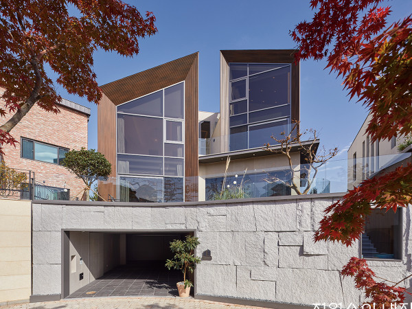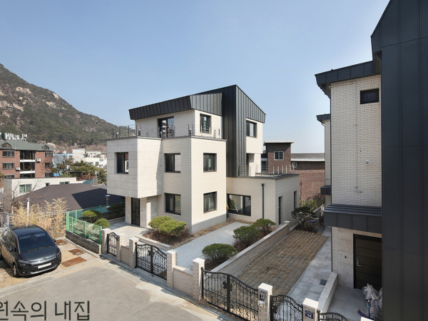 서울 한복판 종로구 청운동. 동네를 아우르는 북악산이 바로 코앞에 펼쳐진다. 도심에서는 좀처럼 찾기 힘든 조용한 입지의 단독주택을 찾았다.LAYOUT & SECTION ① 가족실 ② 침실 ③ 거실 ④ 마스터룸 ⑤ 현관 ⑥ 주방&식당작은 화단이라도 화초를 가꾸며 마당에 발을 붙이고 살아야 집에 대한 애착심이 더 들지 않을까. 때문인지 도심의 대표적인 주거형태인 아파트에 정을 붙이고 살아가기란 쉽지 않은 일인 듯하다. 틀에 박힌 획일적인 형태와 규격화된 공간에 갈수록 고층화되면서 땅 밟을 기회조차 흔치 않은 게 우리네 삶의 일상이다. 건축주는 해외에서 오랫동안 생활했다. 귀국을 결심하고는 본격적으로 주거지를 물색했다. 계획된 여러 일 때문에 서울을 벗어나기는 어렵고, 그렇다고 일반적인 공동주택에서의 생활은 애초부터 고려치 않았다. 그러다가 동쪽으로 북악산, 서쪽으로 인왕산과 경계를 이루는 종로구 청운동에 입지를 정하고 신축을 결정했다. 과거 대기업 회장이 일가를 이룬 동네로 유명한 곳인데, 워낙 한적한 데다 북악산 자락과 바로 면해 여유로운 전원생활을 누리기에 그만이었다.화강석 판석과 이화벽돌을 조경석으로 활용한 진입부방향을 달리한 입면 / 외부 조망을 고려한 창이 두루 배치되었다.HOUSE PLAN대지위치≫ 서울특별시 종로구 청운동 52-127번지대지면적≫ 379.80m2(117.89평)지역지구≫ 제1종일반주거지역, 자연경관지구, 상대보호구역건물규모≫ 지상 3층건축면적≫ 112.31m2 | 연면적≫ 254.55m2(1층-100.97m2, 2층 - 88.58m2, 3층 – 65.00m2)건폐율≫ 29.57% | 용적률≫ 67.02%주차대수≫ 2대 | 최고높이≫ 11.95m구조≫ 기초-철근콘크리트 매트기초 / 지상–철근콘크리트(벽) / 지붕-철근콘크리트 경사지붕단열재≫ THK 135㎜ 우레탄 단열보드외부마감재≫ 벽-이화벽돌(90*225*55) + 대리석(델리카토 브라운 30T) / 지붕-징크 마감창호재≫ LG하우시스 250㎜ PVC 이중 시스템창호(에너지등급 2등급)에너지원≫ 도시가스에어컨≫ 전층 천장형 시스템 에어컨전기·기계≫ 제일이엔씨 | 설비≫ 두준기계설비 | 설계≫ 도가건축시공≫ 투탑건설주식회사 02-2039-1886분양≫ 010-8752-7230조용하고 한적한 주택지로 소문난 곳이라 고급주택들도 주변에 많이 보인다.비정형 대지를 효과적으로 활용하기 위해 주택은 중심부에 앉혀졌다. 도로에 인접한 북서쪽에 주차장과 현관을 두었고, 주택 사방으로 작게나마 마당 요소를 배치하였다. 뒤편에는 거실에서 바로 드나들 수 있는 나지막한 데크가 수목과 어우러져 제법 아늑하다.박스 모양의 매스가 무심히 방향을 달리하며 놓인 듯하면서도 전체적으로 조화롭게 응집된 주택은 철근콘크리트로 지어졌다. 135㎜ 우레탄 단열보드를 포함한 500㎜에 이르는 내외부 벽체 너비가 이 집의 견고함을 대변해준다. 3층 규모, 높이 11.95m에 이르는 볼륨에도 주택이 거대해 보이거나 투박해 보이지 않는다. 철근콘크리트의 차갑고 묵직한 느낌을 은은한 색상의 치장벽돌이 상쇄시켜주는 듯하다. 전면부에는 조적된 벽돌과 함께 브라운 계열의 대리석이 적절하게 가미되면서 한결 고급스러워 보인다. 특히 측면에 아래부터 지붕까지 수직으로 뻗어 올라가는 짙은 색상의 징크가 자칫 밋밋해 보일 수 있는 외관에 무게감을 부여한다.1층 메인 공간인 주방과 거실스킵플로어 방식에 의해 생긴 주방과 거실로 이어지는 계단1층 메인 공간인 주방과 거실. 층고를 높여 시원한 공간이 되었지만, 왠지 아늑한 느낌도 든다.현관에서 내부로 들어서면 바로 게스트룸이 자리한다. 동선과 시선이 복도를 따라 자연스럽게 아래로 향하면서 1층 주방과 거실로 이어진다. 원래는 입구와 같은 레벨에 놓여야 할 주방과 거실은 스킵플로어 방식으로 1m 가량 하단에 두었다. 구조적으로 안정성에 문제가 없었던 기초공사에 대한 아랫집의 우려를 수용해 당초 설계를 수정한 결과이다. 자연 그대로 경사지의 단 차이를 그대로 활용함으로써 상대적으로 주방과 거실 층고를 3.7m로 높였다. 덩달아 창 높이도 2단으로 올리면서 웬만한 갤러리를 연상케 하는 시원한 공간이 탄생하였다.3층까지 이어지는 계단을 일자형으로 설계하여 낭비되는 공간을 최대한 줄였다.시계 방향으로POINT 1_두꺼운 내외부 벽체철근콘트리트 주택만이 가질 수 있는 특권이다. 약 50㎝에 이르는 벽 두께에 우레탄 단열보드를 사용해 단열성을 높였다. 여기에 LG 250㎜ PVC 이중창호를 설치해 패시브하우스급 단열구조를 자랑한다. POINT 2_계단 옆 스마트 조명거주자의 이동을 세심하게 고려한 시공 포인트. 계단 옆 벽에 인입된 스마트 조명이 사용 시에만 센서를 통해 빛을 발한다. 실제 야간에 아래 위층을 오갈 때 아주 유용한 아이템이다. POINT 3_계단실을 활용한 창고주택에서 대표적인 데드 스페이스가 생기는 곳이 바로 계단실이다. 특히나 일자형 계단실은 공간 활용이 어려운데, 측면으로 출입구를 내 한결 넉넉한 수납공간을 확보하였다.2층 마스터룸. 온전히 부부만을 위한 공간으로 마련하였다.마스터룸에서 이어지는 넓은 테라스. 외부 활동을 즐기기에 부족함이 없다.각층 화장실은 디자인과 분위기를 달리하였는데, 수전이나 타일조차도 다