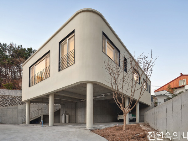 아름다운 바닷가 언덕 한 편. 오래된 마을에 생기를 불어넣는 하얀 집이 지어졌다.필로티 공간인 1층은 넉넉한 주차공간으로 활용 중이다.도심에서 조금 떨어진 조용하고 아름다운 마을. 많은 이들에게 드라이브나 카페 답사 코스로도 사랑받는 경남 창원시 귀산동에 연로한 부모님을 모시고 지낼 주택을 계획했다. 그리곤 구옥을 철거하고 생긴 대지를 가지고 작년 봄, 아키우노종합건설의 박준혁 대표 건축가와 스타일랩 종합건축사사무소의 안응준 소장을 찾아갔다.담백한 입면을 보여주는 주택의 서측. 외관으로는 심플하지만, 오염 등 하자 예방을 위해 창호 시공 전 모두 금속 프레임을 설치했다.“주먹구구식 설계와 인허가 오류를 해결하는 게 급선무였습니다.”박준혁 대표는 당시를 소회하며 그 과정의 지난함에 대해 소개했다. 건축주가 그들을 만나기 전 찾아갔던 설계사무소의 도면을 바로잡아야 했고, 오래된 마을 특유의 어려운 공사 여건은 사이사이 암초처럼 건축 과 정에서 도드라졌다.HOUSE PLAN대지위치≫ 경상남도 창원시 | 대지면적 ≫ 443.00㎡(134평)건물규모≫ 지상 2층| 거주인원≫ 3명(건축주 + 부모님)건축면적≫ 128.65㎡(38.91평) |연면적≫ 120.25㎡(36.37평)건폐율≫ 30.67%(법정 60% 이하) |용적률≫ 28.91%(법정 200% 이하)주차대수≫ 1대 |최고높이≫ 8.10m구조≫ 철근콘크리트 |단열재≫ 비드법보온판 2종1호외부마감재≫ 굵은 스터코(지정 조색)창호재≫ LG하우시스 PVC 이중창 230mm, PVC 프로젝트창에너지원≫ LPG |조경≫ THE SUP디자인≫ 건축가 박준혁, 스타일랩건축사사무소시공≫ ㈜아키우노 종합건설설계≫ ㈜광성산업개발SECTION① 주차장 ② 현관 ③ 거실 ④ 주방 ⑤ 다용도실 ⑥ 안방 ⑦ 욕실 ⑧ 방 ⑨ 복도PLAN2F – 120.25㎡1F – 128.65㎡주택의 가장 끝 북쪽 출입구에서도 막힘없이 바다가 내다보인다.건물고가 높아 바다가 아닌 쪽에서도 산성산의 능선이 이웃집에 가리지 않고 창 안에 그림처럼 담긴다.“진입도로가 너무 좁아 공사 차량이 들어오기 어려웠고, 이웃 간 거리도 너무 짧았다”는 박 대표. 이를 극복하기 위해 그는 대형 현장에 사용하는 펌프차를 동원해 원거리에서 콘크리트를 타설하고, 착공 전부터 이웃과 협의하여 크랙 여부를 치밀하게 추적했다. 장기간의 장마와 코로나19로 인한 건축 환경도 쉽지 않은 난관이었지만, 그 해를 넘기기 전, 건축주 가족은 하얀 피아노를 닮은 집을 만날 수 있었다.부모님이 주로 이용하는 동쪽 현관에는 문턱을 낮추고 벤치를 둬 출입이 편리하게 배려했다.주택은 코너가 부드러운 곡선으로 라운딩 된 ‘ㄱ’자 모양의 매스가 필로티로 떠받힌 모습으로 경사진 대지 위에 놓였다. 필로티로 구성된 1층은 주차공간으로 활용되고, 출입은 난간이 설치된 경사로를 따라 올라가 2층에 위치한 현관을 통해 이뤄진다.필로티 구조를 갖게 된 것은 크게 두 가지 이유였다. 첫 번째는 대지가 언덕 위에 위치하긴 했지만, 먼저 지어진 건물들로 인해 일부 시야가 갑갑해질 수밖에 상황에서 뷰를 확보하기 위해 주거공간이 위로 올라가야 했다. 두 번째는 한정된 건축비. 건물을 위로 올릴 수 있는 용적률은 여유가 있었지만, 건축비는 층을 올리는 만큼 더 들어가야 했다. 박 대표는 “순수 기둥으로만 이뤄진 필로티 공간은 일반 공간 대비평당 60% 정도 시공비로 가능하다”면서, “지금 완성형으로 끝내기보다 살면서 업무공간이나 주거공간이 필요해질 때 증축으로 더해나갈 수 있도록 완성된 디자인 하에서 기반을 마련하는 방향으로 가다듬었다”고 설명했다. 콘센트 위치와 조명선을 미리 공간에 맞춰 배선해두고, 지금은 수돗가처럼 쓰는 급배수시설도 벽체만 세우면 바로 실내처럼 쓸 수 있게 준비해뒀다.안방과 거실은 3연동 슬라이드 도어를 양쪽에 설치해 공간을 분리하면서도 전면부터 곡면까지 창을 크게 내 바다 전망을 와이드하게 담았다.심플하지만, 틈새를 최소화해 청소가 간편한 욕실INTERIOR SOURCE내부마감재≫ 벽 – LG하우시스 실크벽지 / 바닥 – 동화마루 오크욕실 및 주방 타일≫ HS세라믹 HS-9832, HS-66309, HS-9485수전 등 욕실기기≫ 대림바스 양변기, 계림바스 샤워수전, WAVE 주방수전, SMC 욕조, KRL-040 세면기주방 가구≫ 제작가구 |조명≫ T5 간접조명 등계단재·난간≫ Ø19 환봉 난간 위 불소도장(진그레이)현관문≫ 중용 방화문, 복합단열문 |중문≫ 대성도어 922A방문≫ 대성도어 ABS, 6연동 슬라이딩 도어주방 겸 거실. 오른쪽으로는 보조주방을 배치해 살림에 편의를 더했다.실내는 밝고 깔끔하게 정리하는 방향으로 인테리어를 잡았다. 현관을 통해 들어서면 왼편으로는 복도를 따라 방 두 칸이 나란히 놓였고, 오른편으로는 탁 트인 바다 전망이 한 눈에 담긴다. 바다 방향으로는 부모님이 지내실 안방과 거실 겸 주방을 배치했고, 이 두 공간 사이는 슬라이드 도어로 구분해 줬다. 이는 개방감을 더욱 극대화하면서 공간을 자유롭게 활용하고, 부모님의 이동에 장애가 될 만한 부분을 최소화하기 위한 의도였다.PROCESS & TECH POINT아름다운 조망을 갖춘 집도 기본적인 구조와 단열이 제대로 시공되어야 집이 주는 기쁨을 누릴 수 있다.A 입지 판단- 착공 전 