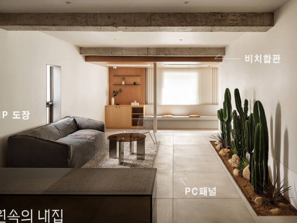 가장 트렌디하고 감각적인 인테리어의 최전선. 다채로운 상업 공간의 설계와 스타일링 중 주택에 적용할 만한 사례를 꼽아 디테일을 들여다본다. 열여섯 번째 장소는 서울시 광진구에 위치한 태닝숍 ‘태닝인더시티’이다.세심한 재료 조합으로완성한 휴양지 무드외출과 여행이 자유롭지 못한 시대. ‘휴식’이라는 집의 기능과 가치가 더욱 소중하게 여겨지는 요즘이다. 서울 광진구 태닝숍 ‘태닝인더시티’는 주거공간은 아니지만, 휴식을 테마로 도심에서 멀리 떨어진 듯 조용하고 차분한 공간 경험을 선사한다. 건축주와 두 번째 연을 맺게 된 스튜디오 프레그먼트는 태닝을 외적인 변화보다 내적 휴식의 측면에서 접근하는 사고방식에 크게 공감했다고. 그리하여 역설적으로, 주된 기능인 태닝보다는 태닝하기 전후, 휴가를 즐기는 여유로움에 초점을 맞추어 자신에게 오롯이 집중할 수 있는 공간이 탄생했다.(위, 아래) 라탄 파티션으로 영역을 구분한 파우더 공간과 휴식공간. 바닥에는 벽과 천장의 합판 마감과 톤을 맞추어 테라코타 타일을 깔았다.PLAN / 2F - 202.2m2간단한 파우더룸까지 포함해 콤팩트하게 구성한 1인 드레스룸이곳은 90년대 지어진 소형빌딩의 한 층을 단독으로 사용한다. 공간은 크게 예약과 안내를 위한 리셉션, 태닝을 위한 방, 태닝하기 전후 간단한 세안 및 정리를 하는 파우더 공간, 대기와 휴식을 위한 라운지로 구성된다. 복도나 통로는 적을수록 본 기능을 하는 공간의 면적을 더 넓게 확보할 수 있지만, 약 60평의 넓은 공간에 의도적으로 좁은 복도를 우선 배치하였다. 한 공간에서 다른 공간으로 이동할 때 복도를 통해야만 갈 수 있도록 동선을 계획한 것. 긴 복도를 걸으며 방문객이 여유를 느낄 수 있게 하기 위함이다.디테일을 최소화한 미니멀 디자인의 리셉션 공간. 트레버린 스터코, 우드, 스틸 등 다양한 소재가 자연스럽게 어우러진다.하나의 오브제처럼 연출한 수전. 벽과 천장에 매입하는 방식으로 설치한다. / 선반은 벽의 타공 위치에 맞추어 옮길 수 있게 했다.리셉션 데스크에 금속 테이블을 연결 제작해 아일랜드 식탁을 연상케 한다.인테리어는 흙과 나무 등 자연이 느껴지면서도 차분하고 편안한 톤의 재료를 선택해 연출했다. 합판, 금속, 스터코, 테라코타 타일 등의 다양한 소재가 이질감 없이 따뜻하게 조화를 이룬다. 라운지는 스킵플로어 형식의 단차를 두어 영역을 구분했고, 파우더 공간은 라탄 파티션을 두어 답답하지 않다. 천장과 벽체에 매입하는 방식의 하드웨어를 사용해 감각적으로 디자인한 리셉션의 수전과 세면대는 주택의 대면형 주방에 응용해볼 만하다. 자유롭게 이동이 가능한 벽 선반 또한 주방 상부장 대신 적용해보면 어떨지. 거실이나 서재 등의 벽면에 설치해도 활용도가 높을 선반 디자인이다.설계 및 시공_Studio Fragment02-6010-8910 www.frgmnt.kr 취재협조_태닝인더시티 구의| 서울시 광진구 구의강변로 93취재_조고은| 사진_김동규ⓒ월간 전원속의 내집/ Vol.266www.uujj.co.kr월간 <전원속의 내집> 의 기사 저작권은 (주)주택문화사에 있습니다. 무단전재, 복사, 배포는 저작권법에 위배되오니 자제해주시기 바랍니다.