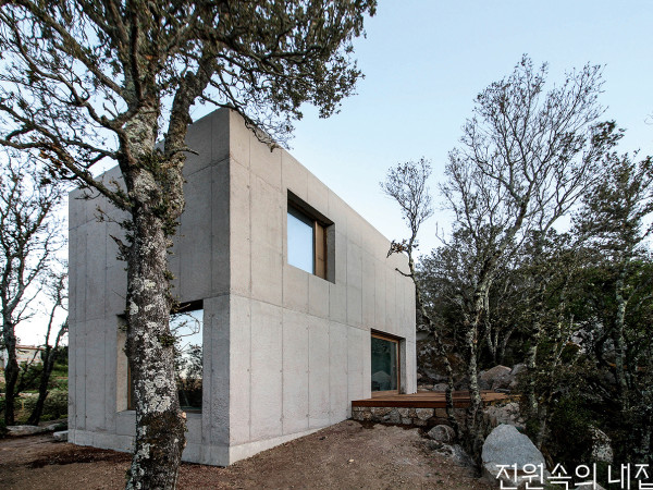 산에 주택이 무심히 자리 잡았다. 네모반듯한 박스 형태의 집은 하늘에서 떨어진 듯 묵직한 존재감을 드러낸다. 건축면적 49m2의 집은 그다지 크지 않지만, 거주자에게 실제 볼륨보다는 넓은 체감을 선사한다. 그 열쇠는 단순한 공간 구성에 있다.HOUSE PLAN프로그램≫ 개인주택 위치≫ 프랑스 소타 마을, 코르시카(Village de Sotta, Corse) 건축면적≫ 49m2 | 건축비용≫ €110,000 사진≫ D. Giancatarina & J. Kerdraon 설계≫ ORMA ARCHITETTURA850m 고지 소타(Village de Sotta) 지역에 작은 별장 겸 주거용 주택이 힘들게 지어졌다. Casa R이라고 명명된 이 건축 프로젝트는 애초부터 상당히 까다로운 조건에서 출발하였다. 집이 자리할 부지가 프랑스 코르시카(Corse) 지방의 험준한 산악 지역에 위치했기 때문이다. 인근은 개발과 무관한 자연지역으로 마을 사람 200명 정도가 옹기종기 모여 사는 자그마한 동네이다.주변에 산재해 있는 암석을 그대로 둔 채 설계 계획이 이뤄졌다.노출콘크리트의 거친 면이 드러나는 단순한 입면에 창호가 포인트로 자리 잡았다.집 주변으로는 온통 바위와 돌, 나무들로 가득한 가운데, 건축면적 49m2(14평)에 불과한 협소한 규모로 설계하였다. 애초부터 계획부지 안에 둥그렇게 연속적으로 놓여 있는 암석들을 있는 그대로 살리자는 데 초점이 맞춰졌다. 그 사이 지면에 최소한의 영향을 미치며 단순하게 집을 앉히는 방법은 하나였다. 주택을 수직으로 놓는 개념의 건축밖에 선택의 여지가 없었다. 이러한 건축사사무소의 계획과 제안을 건축주는 흔쾌히 받아들였다.실내에 별다른 인테리어 보다는 풍경을 담은 액자 같은 창호가 그 역할을 대신한다.데크와 바로 연결되는 미닫이 방식의 커다란 창호1층은 스킵플로어 방식으로 두 블록으로 공간이 나뉘고, 2층으로 연결되는 단출한 계단을 벽면에 배치하였다.사용에 불편함이 없는 주방가구프로젝트에 배정된 예산을 고려하여 주택은 장방형 틀에 입면조차도 불필요한 요소를 최대한 배제하였다. 또한 생활에 꼭 필요한 주거시설 요소만 채워졌을 뿐이다. 대신 사방으로 시원하게 창을 내고 주변의 빼어난 경관을 최대한 끌어들였다. 창은 입면의 단순한 형태를 중화시키는 오브제처럼 사용되어 절제된 존재감을 드러낸다. 특히 주자재로는 주택을 둘러싼 암석과 토양, 석재 등과 잘 어울리는 모래와 시멘트의 조합인 콘크리트를 필연적으로 채택할 수밖에 없었다.입면에서의 창의 위치 선정은 내부의 평면 구획과 연계되어 계획되었다. / 노출콘크리트와 물성상 대비되는 목재 창호를 사용하였다. 자재로서의 기능뿐만 아니라 심미적으로도 잘 어울린다.여러 건축적 장치를 다양하게 활용하기보다는 꼭 필요한 시설만 구비하였다. 대신 사방으로 넓고 시원한 창을 내 주변의 빼어난 경관을 집 안에서 충분히 누릴 수 있도록 하였다. / 건축면적 49m2인 작은 볼륨의 주택은 단순한 입면과 평면 설계로 거주자에게 더욱 넓은 체감을 선사한다.저녁에 실내에 불이 들어오면 집은 또다른 독특한 분위기를 만든다.주택은 설계 프로그램의 의도를 온전히 수용하듯 마치 하나의 돌덩이처럼 보이지만, 안으로 들어서면 분위기는 전혀 달라진다. 실내는 하얀 느낌이 지배적인데, 이와 극명하게 대비되면서도 조화를 이루는 목재 창호가 인상적이다.취재_이준희ⓒ월간 전원속의 내집/ Vol.266www.uujj.co.kr월간 <전원속의 내집> 의 기사 저작권은 (주)주택문화사에 있습니다. 무단전재, 복사, 배포는 저작권법에 위배되오니 자제해주시기 바랍니다.