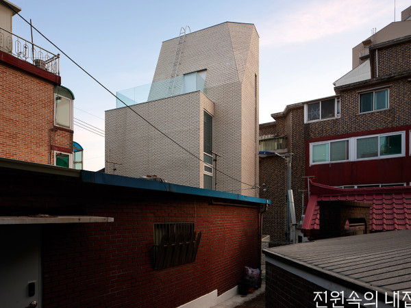오래된 주택가, 그곳에서도 골목 안쪽으로 깊숙이 굽어 들어가야만 비로소 마주할 수 있는 벽돌집. 그동안 공동 주거 형태에서만 지내왔다는 박규혁, 양리원 씨 부부가 긴 시간 고심 끝에 지은 협소주택이다. 집을 짓겠다 결정하곤 서울 중심지와 접근성이 좋고 공원 등의 인프라가 잘 갖춰진 곳을 중점적으로 알아보았던 두 사람에게 이곳은 재정적인 여건과도 잘 부합한 만족스러운 동네였다.SECTION ① 마당 ② 현관 ③ 사무실 ④ 화장실 ⑤ 보일러실 ⑥ 실외 데크 ⑦ 창고/계단 ⑧ 작업실 ⑨ 탕비실 ⑩ 거실 ⑪ 주방 ⑫ 세탁실 ⑬ 팬트리 ⑭ 침실 ⑮ 테라스 서재3층 주방 겸 거실 모습. 원래 있던 15년 된 구옥의 리모델링도 고려해보았으나, 구조적인 문제를 포함해 기존 건물의 틀에서 벗어나 조금 더 자유로운 평면 구상을 하고자 충분한 논의 후 신축으로 결론을 냈다. 층별 프로그램 배치, 실 구획을 통해 부부가 필요로 하는 공간이 총 5개 층에 반영되었다.옆 골목 너머에서 본 동측 전경. 큰 도로변의 필지들은 하나로 묶여 아파트 단지로 개발되고, 남겨진 집들은 오래된 주택가의 모습을 간직하고 있는 동네 풍경을 고려해 외장재는 이웃집 속에 함께 녹아들 수 있도록 그들과 같은 질감을 갖는 벽돌을 선택했다.“건축일을 하고 있다 보니 직접 짓는다면 최소한 우리에게만큼은 부족함이 없는, 그 어떤 프로젝트보다 더 완벽히 하고 싶었어요. 그래서 저의 꿈 같은 계획을 채워주고 잡아줄 수 있는 친한 동생이자 건축가 안수인과 의기투합해 본격적으로 작업을 진행하게 되었습니다.”자신 있게 시작했지만, 땅부터 만만치 않았다. 집이 놓일 대지는 동서남북 어디에서도 건물 전체 입면을 한 번에 보기 어려운 골목길에 자리하고 있었다. 좁은 곳이 채 1m를 넘지 못하는 도로는 차량 진입이 불가능했고, 여기에 도로로 사용할 부분을 제하고 나면 61m2(18평)의 면적과 10개의 각을 가진 대지가 남는 상황이었다.HOUSE PLAN대지위치 서울시 마포구 대지면적 61.04m2(18.46평) : 도로 공제 후 면적 건물규모 지상 5층 거주인원 2명(부부) 건축면적 33.42m2(10.10평) 연면적 112.42m2(34.00평) 건폐율 54.75% 용적률 184.17% 최고높이 14m 구조 기초 – 지내력 기초 / 지상 – 철근콘크리트 단열재 우레탄폼 2종2호 외부마감재 벽돌 담장재 벽돌쌓기 창호재 이건창호 THK38 로이삼중유리 에너지원 도시가스 전기·기계 하이텍이피씨 구조설계(내진) 네오엔지니어링 시공 건축주 직영 설계 안수인건축사사무소 + 박규혁처음부터 그 자리에 있었던 것처럼 주변과 잘 어우러진 주택의 외관오후에 깊게 빛이 들어온 출입구 앞 데크. 목재 루버는 현관 공간을 돋보이게 하며 정면성을 가져왔다.“주차장을 설치하지 못하는 건물의 최대 주택 면적은 타 용도를 제외하고 50m2*를 넘을 수가 없어요. 따라서 이런 조건을 풀기 위해 설계 초기 단계에서부터 건축주와 건물의 규모, 용도에 관한 대화를 충분히 나누었죠.”* 주차장법 시행령 부설주차장의 설치대상 시설물 종류 및 설치기준(제6조 제1항 관련)에 따라 단독주택(다가구주택 제외)의 경우 시설면적 50m2 초과 150m2 이하일 때 주차대수 1대로 산정한다.좁은 대지라는 제약 속에서 필요 요소는 챙기되, 작은 부분도 허투루 쓰지 않도록 서로 아이디어를 공유하며 한 층씩 차곡차곡 쌓아 올렸다. 집들이 옹기종기 붙어있다 보니 공사 초기 민원이 많았고 그로 인해 일정은 예정보다 3배 가까이 지연되는 어려움도 있었지만, 끈기 있게 소통하며 대응하고 해결한 덕분에 약 1년의 기다림을 거쳐 지금의 집을 만날 수 있었다.(위, 아래) 3층 주방 및 식당. 내부 구성에 있어 구조 자체가 마감이자 공간 사이의 구획 역할을 하므로 공법을 신중하게 선택하였다. 남쪽으로 둔 커다란 창문은 마침맞게 벌어진 앞집 사이의 틈으로 충분한 빛을 담아낸다.(시계방향으로)POINT 1_동네의 뷰를 담은 서재 건물 꼭대기에 자리한 서재. 이 집에서 가장 작은 공간이지만, 동네 풍광을 가득 담으며 가장 넓은 시야를 가진다. POINT 2_집 전체를 관통하는 책장 내부에서 눈에 띄는 부분 중 하나인 책장. 난간의 역할을 겸하는 책장은 수직 방향으로 놓여 집의 중심을 잡아준다. POINT 3_슬라이딩 도어로 감춘 수납 협소한 공간인 만큼 수납 역시 꼼꼼하게 신경 썼다. 화장실, 팬트리, 세탁실, 수납장들은 곳곳에 숨기고 슬라이딩 도어로 깔끔함을 더했다.INTERIOR SOURCE내부마감재 벽 – 노출콘크리트 / 바닥 –구정마루 티크스카치, 레진모르타르 욕실 및 주방 타일 600×600 수입 타일 수전 등 욕실기기 아메리칸스탠다드, 대림바스 주방 가구·붙박이장 가인 조명 T5 LED 간접 조명 계단재·난간 멀바우 + 책장 난간 현관문 방화철문 위 목재 루버 제작 방문 목문 슬라이딩 도어 제작 데크재 방킬라이 22mm 가구 제작 가인4, 5층의 동쪽으로 크게 열린 커튼월이 한정된 공간에 온 동네의 풍경을 끌어들인다.① 마당 ② 현관 ③ 사무실 ④ 화장실 ⑤ 보일러실 ⑥ 실외 데크 ⑦ 창고/계단 ⑧ 작업실 ⑨ 탕비실 ⑩ 거실 ⑪ 주방 ⑫ 세탁실 ⑬ 팬트리 ⑭ 침실 ⑮ 테라스 서재그렇게 완성된 5층 협소주택. 1층은 임대 공간, 2층은 건축 설계를 하는 건축주의 사무실, 3