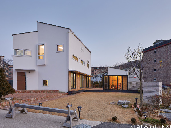 아이들의 기억 속 한편에 따스한 집이 함께 하길 바라는 마음으로 시작한 집짓기. 그 애틋함이 고스란히 담긴 네 식구의 보금자리에는 즐거운 일상이 쌓여간다.SECTION ① 현관 ② 거실 ③ 식당 ④ 주방 ⑤ 다용도실 ⑥ 화장실 ⑦ 썬룸 ⑧ 마당 ⑨ 앞마당 ⑩ 중간마당 ⑪ 침실 ⑫ 놀이방 ⑬ 욕실 ⑭ 세탁실폴딩도어를 활짝 연 썬룸에서 바라본 본채 쪽 모습5살 터울의 남매를 둔 부부는 아이들이 건강하게 뛰놀 수 있는 환경을 만들어주고자 주택행을 결심했다. 이후 여느 건축주와 마찬가지로 어렵게 땅을 정하고 가족에게 딱 맞는 집을 지어줄 건축가를 찾아 열심히 발품을 팔았다.“선뜻 건축가를 선택하지 못하고 고민하고 있을 때, 지인을 통해 씨엘건축사사무소 김길령 소장님을 소개받았어요. 설계하신 주택을 함께 둘러보며 작업방식에 대한 설명을 듣고 나니 마음이 정해지더라고요. 더는 주저할 이유 없이 두 번째 만남에서 바로 계약했답니다.”순조롭게 일이 진행되는 듯했지만, 아직 해결해야 할 문제가 하나 남아있었다. 그것은 땅. 집이 놓일 대지는 전면에 구거(溝渠)가 있고, 주변이 다세대 건물로 둘러싸여 있는 등 주택이 지어지기에 좋은 조건이 아니었다. 따라서 사방으로 시선이 열린 상황에서의 프라이버시 확보는 이 집에서 첫 번째로 다뤄야 할 중요한 요소였다.두 개의 매스로 분리한 주택. 서로 마주 보는 면은 큰 창과 목재 마감으로 개방감을 주어 함께 소통할 수 있도록 했다.백고벽돌 담장은 건물과 비슷한 느낌으로 한 겹 더 둘러쳐 가족의 프라이버시를 보호한다.김 소장은 “우선 건물을 두 채로 분리하여 각 건물이 서로를 보호할 수 있도록 계획하고, 주위 건물과 시선이 어긋나도록 사선으로 배치해 땅이 가진 문제점을 보완하고자 했다”며 “이로 인해 자연스럽게 생긴 작은 여백들은 추후 가족의 다양한 야외공간으로 활용될 수 있었다”고 설명했다.HOUSE PLAN대지위치경기도 광주시 대지면적364m2(110.11평) 건물규모지상 2층 거주인원 4명(부부 + 자녀 2) 건축면적72.75m2(22평) | 연면적136.56m2(41.30평) 건폐율19.98% | 용적률37.52% 주차대수1대 최고높이8.38m 구조기초 – 철근콘크리트 매트기초 / 벽 – 경량목구조 2×6 구조목 / 지붕 – 2×10 구조목단열재수성연질폼 외부마감재벽 – STO 외단열시스템, 루나우드 / 지붕 – 컬러강판 담장재백고벽돌 창호재융기드리움 PVC 시스템창호(에너지등급 2등급) 철물하드웨어심슨스트롱타이 에너지원도시가스 시공윤형근 설계씨엘건축사사무소 김길령깊은 캐노피가 있는 툇마루를 본채와 썬룸에 모두 놓았다. 특히 썬룸에는 다양한 활용도를 고려해 폴딩도어를 설치해 주었다. / 본채와 썬룸 사이에 중간 마당을 두어 아이들은 썬룸과 식당을 자유롭게 오갈 수 있다.중목구조가 노출된 주방 및 식당POINT 1_순환하는 동선거실과 주방 사이에 슬라이딩 도어를 설치하여 필요에 따라 여닫을 수 있도록 하고, 문을 다 열었을 땐 언제든 아이들이 자유롭게 뛰어다닐 수 있는 순환 동선을 계획했다. POINT 2_목재를 활용한 내부실내 공간은 화이트와 우드로 통일했다. 목구조 노출, 합판, 자작나무 등을 주요 마감재로 사용한 덕분에 전체적으로 포근하고 아늑한 분위기를 연출할 수 있었다. POINT 3_거주자를 배려한 공간아이들을 위해 집을 지은 만큼 집 안 곳곳에는 거주자를 배려한 부분들이 눈에 띈다. 2층 욕실의 경우 모자이크 타일로 좌식 목욕탕을 만들어 어린 자녀를 씻기기 편리하도록 해주었다.공간의 깊이감이 전해지는 현관에서 본 1층 전경. 현관 앞에는 외출 후 바로 손을 씻을 수 있는 세면 공간을 마련해두었다.썬룸으로 연결되는 내부밝고 환한 집, 튼튼한 집, 무엇보다 아이들에게 좋은 집을 원한 부부의 바람을 담아 5개월의 집짓기가 마무리되었다. 본채와 썬룸으로 이뤄진 집은 경량목구조에 일부 중목구조를 노출해 완성했다. 외장은 STO 외단열시스템으로 두 개의 매스를 동일하게 처리하고, 마주 보는 면은 루나우드로 마감하여 단조로움을 피하는 동시에 다소 밋밋해지기 쉬운 벽면에 포인트 요소를 만들어주었다. 또한, 최대한 공간을 열어 각 장소로의 이동이 자연스레 흐를 수 있게 해달라는 건축주의 요청에 따라 툇마루와 거실, 주방, 식당을 연결하고, 중간마당과 썬룸, 작은 마당들까지 골고루 닿을 수 있는 순환 동선을 계획하였다.INTERIOR SOURCE내부마감재벽 – 벤자민무어 친환경 도장, 에덴바이오 벽지 / 바닥 – 구정마루, 합판마루, 포세린 타일 욕실 및 주방 타일카나세라믹, 예인세라믹 수전 등 욕실기기대림 주방 가구·붙박이장공간인테리어 조명모던라이팅 계단재·난간티크집성목 + 환봉 난간 현관문성일도어 중문·방문예가도어 데크재방킬라이 19㎜주방과 마주한 낮은 계단에서 아이들은 앉아 책도 읽고 이야기도 나눈다.2층으로 오르면 넓은 놀이 공간이 펼쳐진다. 수납도 가능한 윈도우시트 옆으로 다락과 이어지는 계단이 있다.내부는 화이트, 우드로 담백하게 인테리어했다. 노출된 중목구조는 그 자체로 이 집의 중심이 되며 부드럽고 따뜻한 분위기를 연출한다. 1층은 거실, 주방, 식당 등 공적 공간을 두어 함께 어울릴 수 있게 하