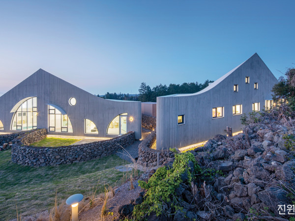 “뛰지 마!”본능적으로 소리치고선 금세 미안하고 까치발을 들고 다니는 걸 보면 안쓰러운 게 부모 마음. 아이가 자유롭게 클 수 있도록, 특별한 공간을 누리도록 젊은 부부들이 과감히 아파트 탈출을 선언하고 있다. 여기, 선배 건축주들이 먼저 만들어 본 아이를 위한 장치부터, 전문가들의 실질적인 인테리어 조언, 최근 집을 짓고 아이와 함께 행복한 나날을 보내는 두 가족의 집짓기 후기를 담았다. 그동안 품어왔던 궁금증을 해소했다면, 이제 아이를 위해 용기 낼 일만 남았다.동화 속에서 본 것 같은 신비로운 형태의 집. 야트마한 언덕 아래 펼쳐진 세모, 네모, 동그라미 다채로운 도형 안에서 오늘도 아이들은 무럭무럭 자란다.아이의, 아이에 의한, 아이를 위한 공간청량한 민트색 타일이 재미를 배가시켜주는 풀장. 70cm 정도의 수심에 24시간 자동 순환·여과시스템으로 안정성을 확보했다. 부채꼴 큰 창으로 자연 채광이 들어와 마치 밖에서 물놀이 하는 기분을 선사한다.제주에서 평생을 살아온, 두 살 터울의 초등학생 삼 남매를 둔 건축주 부부. 연세(年貰) 임대주택 3년, 구옥 리모델링 8년 총 11년의 단독주택 생활을 거쳐, 한라산을 등지고 바다를 내다보는 언덕 위에 가족만의 집을 짓기로 결심했다.작은 마당에서도 즐거워하던 아이들의 웃음은 광활한 땅이 가진 잠재력과 상상력을 일깨웠다. 거주 목적의 단독주택과 함께 아이 친화적인 민박까지 두기로 한 것이다. 평소 아이들을 데리고 다니면서 힘들었던 경험, 환영받지 못하던 분위기를 여기서만큼은 느끼지 않게 오직 아이들을 위한 공간을 건축가와 함께 그려나갔다.실내 온수풀, 모래 놀이터, 볼풀, 잔디 동산, 피크닉 전용 오두막 등 키즈카페를 방불케 하는 놀이 천국은 오로지 아이들의 눈높이에 맞게 설계했다. 침실과 화장실을 제외하고 모든 내부 공간이 한눈에 보이도록 경계 없이 배치돼 아이들은 자유롭게 움직이고, 부모는 안심하고 지켜볼 수 있다. 집에서는 쉽게 볼 수 없었던 삼각형의 평면, 곡선의 창문, 파스텔톤의 가구 등 다양한 공간 체험이 아이들의 오감을 자극한다.해 질 녘의 선흘아이. 비현실적인 모습이지만, 단순하면서도 직관적인 외관은 풍경 속에 자연스럽게 녹아든다.DIAGRAMHOUSE PLAN대지위치 ▶ 제주특별자치도 제주시 조천읍 선흘남4길 37-2 대지면적 ▶ 1,575 (476.43평)|건물규모 ▶ 지상 1층(주동 + 민박동)|거주인원 ▶ 5명(부부 + 자녀3) 건축면적 ▶ 316.85 (95.84평)|연면적 ▶ 296.19 (89.59평) 건폐율 ▶ 20.12%|용적률 ▶ 18.81% 주차대수 ▶ 4대|최고높이 ▶ 7.6m(주동), 8.1m(민박동) 구조 ▶ 기초 - 철근콘크리트 매트기초 / 지상 -철근콘크리트 단열재 ▶ 수성연질폼 100㎜ 외부마감재 ▶ 외벽 - 골패턴 콘크리트 / 지붕 – 무근콘크리트 위 수성페인트 담장재 ▶ 제주 자연석 쌓기 창호재 ▶ 이건창호 PVC 시스템, 알루미늄 창호 43mm 삼중유리, 제작 커튼월 등 조경 ▶ 듀송 플레이스 전기·기계·설비 ▶ 정연엔지니어링 구조설계 ▶ 한길구조엔지니어링 설계 ▶ ㈜요앞건축사사무소 070-7558-2524 http://yoap.kr 시공 ▶ G.A.U 아키팩토리INTERIOR SOURCE내부마감재 ▶ 벽, 천장 - 아이생각 친환경수성페인트 / 바닥 - 엘림 마모륨(프레스코, 콘크리트), LG하우시스 강마루 욕실 및 주방 타일 ▶ 이공세라믹, 이누스 수전 등 욕실기기 ▶ 대림바스, 이케아, 이시스, 앙트레 주방 가구 및 붙박이장 ▶ 와셀로 www.wacello.co.kr, 이케아 조명 ▶ 루이스 폴센, 르위켄 계단재·난간 ▶ 멀바우 + 강화유리 제작 현관문 ▶ YKKAP 베나토 w04 러스틱 우드 중문 ▶ 제작 슬라이딩 도어 금속자재 + 도장 마감 + 망입유리 방문 ▶ 영림임업 ABS 도어 데크재 ▶ 현무암 판석HOUSE POINT - 민박동각 호 앞에는 돌담으로 둘러싸인 반원형의 전용 마당과 모래 놀이터가 준비되어 있다. 수영장 벽체는 유리벽으로 가볍게 구획해 놀이터, 거실, 식당 등의 경계 없이 한 공간을 이룬다.체크인 시간이 오후 4시경인 것을 감안, 큰 창을 통해 오후 햇살이 스며들도록 건물을 남서쪽으로 길게 배치했다. 실내로 들어오면, 풀장에 쏟아진 빛이 영롱하게 반사하는 순간을 경험하게 된다.수영장 말고 볼풀 역시 아이들이 좋아하는 실내 놀이터다. 왠지 자주 손 씻고 싶은 산뜻한 핑크색 세면볼과 연두색 수납장 역시 시선을 사로잡는다. 알록달록한 조명은 루이스 폴센 Cirque Pendant 제품.단지로 처음 들어섰을 때 보이는 건물의 입면. 수직 패턴을 입힌 노출콘크리트는 제주 돌담이나 현무암의 거친 질감을 연상시키고, 둥글게 표현한 코너부는 마치 하나의 덩어리처럼 느껴진다.상상과 현실 사이, 동화책에서 본 듯한 주택동화책에서 나온 집 같은 유선형의 지붕 곡선은 산·파도·바람 등 제주의 자연을 연상시킨다. 이를 극대화하는 노출 콘크리트 수직 패턴 역시 제주에서만 볼 수 있는 돌담과 현무암에서 느껴지는 질감을 표현한 결과다.건축주 가족이 거주하는 주택은 전체 분위기를 이어가되, 실용성을 우선순위에 두었다. 우선, 민박동과 동선이나 시선이 겹치지 않도록 45° 틀어서 남향을 바라보도록 배치했다. 두 딸을 위해 화장실 딸린 넓은 방을 주고, 아들에게는 다락을 선물했다. 남쪽으로는 독립