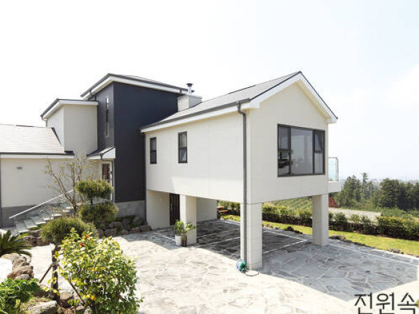 어디에든 좋은 풍경을 많이 품고 있는 제주이지만, 그중에서도 손에 꼽힐 아름다운 경치가 이곳에 있다. 전망 좋은 대지에 일본식 프리컷 중목구조로 지어진 애월읍 주택을 찾았다.제주시 서쪽, 애월읍 초입에 위치한 광령리. 그곳에 중목구조로 지어진 주택 한 채가 초록빛 귤밭 위에 떠 있다. 제주에 정착한 지 30여 년이 넘은 시점에 건축주는 새로 집을 짓기로 결심했다. 개조해 살던 주택은 시간이 지날수록 손 볼 곳이 많아졌고, '집'이 오히려 '짐'이 되는 시점이었다.전망이 좋은 측면에는 넓은 창을 내어 제주의 아름다움을 마음껏 감상할 수 있다.HOUSE PLAN대지위치제주특별자치도 제주시 애월읍 | 대지면적669㎡(202.37평) |건물규모지상 2층 |건축면적132.58㎡(40.10평) | 연면적176.4㎡(53.36평) | 건폐율19.82% | 용적률26.37% | 주차대수 2대 | 최고높이 8.85m | 공법 기초 - 철근콘크리트 줄기초, 지상 – 중목구조 | 구조재벽, 지붕 - 삼나무 구조목 | 지붕마감재KMEW 세라믹기와 | 외벽마감재KMEW 세라믹사이딩 | 단열재ECOBATT 그라스울 나등급 |창호재ENSUM 독일식 시스템 창호 | 설계산방건축사사무소 064-792-3811 |시공(주)JD홈플랜 064-747-2178 www.jdhomeplan.com건축주와 이 집을 시공한 ㈜JD홈플랜 대표는 오랜 기간 알고 지내온 사이로, 집짓기 전 대지를 구입하는 것부터 많은 대화가 오고 갔다. 그러던 중 애월읍에서 아직 사람의 손이 닿지 않은 부지 일대를 발견하였고, 불모지의 땅을 하나둘 정리하고 나니 땅은 최고의 전망을 가진 매력적인 곳으로 변모했다.잘 정리된 정원과 어우러진 주택. 1층 일부는 필로티 구조로, 주차장을 계획했다.이곳은 주변 일대보다 높은 고도에 위치하여 제주 시내와 바다가 한눈에 내려다보이고, 새로운 땅으로는 근래에 보기 힘든 전망을 가진 장소였다. 이러한 대지의 특성은 자연스레 집에 대한 건축주의 생각도 다시 정리하게 해주었다.중목구조 시공과정01부재별로 포장되어 현장에 입고된 삼나무 구조목 /02중목구조의 정교한 결합은 수평모르타르 작업에서 시작된다. 03공장에서 프리컷된 부재들은 현장에서 각각 결합된다. /04부재들은 철물에 의해 결합되므로 망치만으로 시공된다. 05구조목과 철물의 결합으로 완성된 중목구조 형태 / 06중목의 뼈대에 벽의 구성을 위해 샛기둥이 시공된다. 07골조 시공 이후의 시공과정은 경량목구조와 동일하다. /08제주의 기후에 맞추어 레인스크린은 필수적으로 시공한다. 중목구조가 그대로 드러난 거실 천장과 자연을 한껏 담아낸 창이 서로 조화를 이룬다."차를 타고 복잡한 시내를 지나 인적이 드문 전원에 들어서는 과정이 집에도 반영되길 원했죠. 차에서 내려 집 안에 들어서면 공적인 생활공간을 거쳐 사적인 공간에 이르기까지, 대지가 지니는 장점들이 집에 그대로 묻어나길 바랐어요."나무 향이 전해지는 깔끔한 2층 욕실내부는 스킵플로어 방식으로 설계되어 공간이 효율적으로 분리된다.이러한 건축주의 요구사항은 주차장 필로티 공간과 내부 스킵플로어(Skip Floor) 방식으로 적용되었다. 대지의 출입이 가까운 곳에 2대의 주차공간을 두고 그 위에 놓인 주방과 거실은 심플한 박공지붕을 앉혔다. 반면 대지 후면의 아래층은 손님 공간, 위층은 주인 공간으로, 이곳은 완만한 평지붕으로 생활공간이 이어진다. 이 둘의 매스 사이에 위치한 계단은 첨탑의 모양으로 각각의 공간을 반 층으로 묶어주고 있다. ㈜JD홈플랜 대표는 "이전부터 제주의 기후환경과 비슷한 일본의 중목구조에 관심을 두고 있었는데, 마침 럼버미야자키조합의 초청으로 일본의 중목구조의 산업을 순방할 기회가 닿았다"며 "이를 계기로 제주에서 일본식 중목구조의 시공을 할 수 있는 방안을 모색하고, 수순을 밟아 나갔다"고 전했다.이 집에서 가장 멋진 풍광을 바라볼 수 있는 2층 부부 침실Interior Source내벽 마감재규조토 + 벽지 | 바닥재구정마루 강마루 | 욕실 및 주방타일수입타일 | 수전 등 욕실기기이누스 | 주방가구한샘 조명 LED조명 |계단재CLT합판 | 현관문코렐도어 | 방문CLT합판제작 | 붙박이장한샘 | 데크재제주 현무암, 방부목높은 층고 덕분에 작은 다락도 마련되었다. / 콤팩트한 주방 뒤로 널찍한 다용도실이 자리한다. 주방 옆에 놓인 난로는 운치 있는 거실공간을 연출해준다.일본의 중목구조 산업은 의뢰하는 설계에 맞추어 구조재의 크기와 결합방식에도 내진설계가 이루어져 제작된다. 그렇게 만들어진 각각의 부재는 정해진 시공 매뉴얼이 요구되고, 럼버미야자키조합의 협력회사의 시공기술을 전수받아 콘크리트 기초에서부터 일본의 중목구조 기술을 최대한 반영하여 집을 시공하였다. 중목구조의 특성을 그대로 내부에 표현하기 위해 구조미가 돋보이는 공간은 기둥과 보를 노출하여 규조토로 마감하였다. 여기에 내부도어는 CLT합판으로 주문제작하여 전체적으로 나무가 돋보이는 따뜻한 공간을 연출할 수 있었다. 구조에서부터 마감재에 이르기까지 새로운 소재와 시공방법이 적용되어 여러 전문가들의 의견 조율이 많이 필요했던 현장이었다.지인들의 발걸음이 끊이지 않는다. 잘 지었다는 칭찬이 그저 쑥스럽기만 한 부부는 집을 짓고 마음 부자가 되었다. 