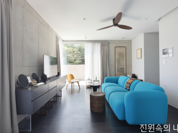 짙푸른 숲과 조용한 거리가 맞아주는 서울 청운동 한편. 긴 여정 끝에 돌아온 자매가 취향 가득 담긴 집을 지었다.숲과 주택들이 어우러진 서울 청운동의 동네 풍경은 겨우 10분 거리인 역동적인 도심과 달리 차분하고 고즈넉하다. 그곳에서도 숲에 접하는 아늑한 자리에 단단한 존재감을 내는 건축주 자매의 주택이 자리잡았다.1 거친 노출콘크리트 마감과 블랙 톤의 마루로 차분한 분위기 속에서 소파가 강렬한 존재감을 내는 1층 언니 세대 거실“아마 ‘고향에 돌아왔다’라는 게 이런 느낌일까 싶었죠.” 언니는 지금의 주택 부지를 만났을 때 운명을 느꼈다고 입을 뗐다. 어릴 적 떠났지만, 이곳을 늘 고향처럼 마음에 품고 있었다고. 부지가 나왔음을 우연히 알고, 자매는 누가 먼저랄 것 없이 같이 지낼 집을 위해 의견을 모았다. 계기는 우연이었지만, 인테리어에 관심이 많았던 자매는 완성도 높은 건축과 인테리어를 위해 설계 때부터 이 두 가지를 적극적으로 조화시키고자 준비했다.2 최대한 덜어내 담백한 주택의 입면. 지하 1층에는 사무실, 지상 1~3층에는 주거공간으로 구성했다.(왼쪽) / 3 전면보다 다채로워진 매스의 모서리 안에는 조경을 틈틈이 녹여냈다.(오른쪽)많은 고민을 거쳐 ‘씨노플랜’, ‘오엘건축사사무소’를 집을 향한 길잡이로 삼았고, 봄기운이 느껴지는 지난 3월, 두 자매는 나중에 합류한 이모님과 함께 바라던 집을 맞이했다.HOUSE PLAN대지위치 ▶ 서울시 종로구│대지면적 ▶ 312.7㎡(94.59평) 건물규모 ▶ 지하 1층, 지상 3층│거주인원 ▶ 5명(언니 세대 2, 이모 세대 1, 동생 세대 2) 건축면적 ▶ 93.7㎡(28.34평)│연면적 ▶ 266.43㎡(80.6평) 건폐율 ▶ 29.96%(법정 30%)│용적률 ▶ 85.2%(법정 90%) 주차대수 ▶ 4대│최고높이 ▶ 11.99m(법정 12m) 구조 ▶ 철근콘크리트│단열재 ▶ 비드법단열재 2종1호 190mm 외부마감재 ▶ 벽돌타일, 종석긁기│담장재 ▶ 두라스택 큐블록Q2, 평철 창호재 ▶ ㈜필로브이엔씨 32×170mm 불소수지 알루미늄 폴리아미드 단열바 47mm 양면로이 투명삼중유리 열회수환기장치 ▶ LG전자│에너지원 ▶ 도시가스 조경 ▶ JJ GARDEN STUDIO│전기·소방 ▶ 청효하이텍│구조설계 ▶ 드림구조 시공 ▶ 소요종합건설㈜ 설계 ▶ ㈜오엘건축사사무소 www.studio-OL.com 인테리어 설계·시공 ▶ ㈜씨노플랜 02-558-9877 www.cenoplan.comINTERIOR SOURCE내부마감재 ▶ 벽 - 노루페인트(거실·주방·천장), 대우벽지(침실· 드레스룸) / 바닥 - 구정마루 프레스티지 욕실 및 주방 타일 ▶ 두오모, 두베세라믹 수전 등 욕실기기 ▶ 아메리칸스탠다드, Kaldewei, Grohe, 이케아, 더하우스샵, PURO, 바노테크 주방 가구 ▶ LUBHE(루베)│식탁·TV장 ▶ 씨노플랜 디자인 소파 ▶ 알로소 케렌시아│조명 ▶ 콘란샵, 비채나 계단재·난간 ▶ 모르타르 마감 + 평철 난간 현관문 ▶ 여다지 YED330│중문 ▶ 위드지스 ALU-SD 1742 방문·붙박이장 ▶ 성지에프앤디│벽난로 ▶ 왐코리아 wiking_Mini2PLAN2F, 3F - 94.14㎡(왼쪽) / ROOFB1F – 156.32㎡ / 1F – 94.14㎡4 식당부터 거실까지는 공간을 큰 덩어리로 구성해 시원하게 연출했다.지하 1층, 지상 3층 규모로 지어진 집 외관에는 동네에 대한 애정과 배려를 담았다. 어렸을 때 이웃과 친구들이 아직 이곳에 남아있을 만큼 오래 터를 잡아 온 사람들이 많은 동네였고, 풍성한 녹색이 배경인 만큼 개성적인 파사드로 이질감을 더하고 싶지 않았기 때문이다. 주택은 단정한 매스에 채도 낮은 붉은 벽돌 타일을 신중하게 선택해 적용했다.5,6 거실과 현관에서 직접적으로 주방 및 식당이 시선에 바로 노출되지 않도록 루버를 둘렀다.실내는 건폐율과 엘리베이터 등으로 줄어든 면적에서 안으로는 미니멀함을, 바깥으로는 시원한 느낌을 조화시키는 것이 관건이었다. 오엘건축사사무소의 이혁 소장은 “공용공간은 최대한 단순화하고 창을 크게 배치해 ‘시원함’을 확보, 나머지 공간은 쪼개서 아기자기하면서도 기능적인 ‘미니멀’을 구현했다”며 설계 흐름을 설명했다. 이에 주방과 식당, 거실은 하나의 덩어리로 놓였지만, 나머지 공간은 복도를 중심으로 침실, 욕실, 수납공간, 드레스룸이 집약적으로 배치되었다.SPACE POINT7 군더더기 없이 간결한 실루엣으로 모든 공간에 조화로운 알로소의 ‘티암’ 수납장이 자리한다.8 시내가 내려다보이는 윈도우시트에서 쉬고 있는 동생 가족의 반려묘 ‘레오’POINT 1 반려묘를 위한 소파 : 반려묘가 있는 동생 세대에는 퍼시스그룹의 소파 전문 브랜드 알로소의 ‘케렌시아’로 포근한 플레이그라운드를 꾸몄다. 저상형으로 설계된 낮은 좌고와 오염 방지 기능이 적용된 소재는 반려묘와의 일상에도 안심이다.POINT 2 코너창과 윈도우시트 : 시내 뷰를 조망할 수 있는 코너창 앞으로 윈도우 시트를 배치했다. 소파와의 자연스러운 연결을 위해 팔걸이, 높이를 미리 파악하고 준비했다.POINT 3 노출콘크리트와 선반 : 거친 물성의 노출콘크리트 앞으로는 선반이 배치되었다. 선반은 구조에서 직접 뽑아낸 것으로, 표면을 블랙 컬러 철판으로 둘렀다.인테리어는 창에서부터 순차적으로 풀어나갔다. 각 층은 구조 자체는 같았지만, 도심 뷰가 강조되는 2, 3층과 정원과의 관계가 강조되는 1층