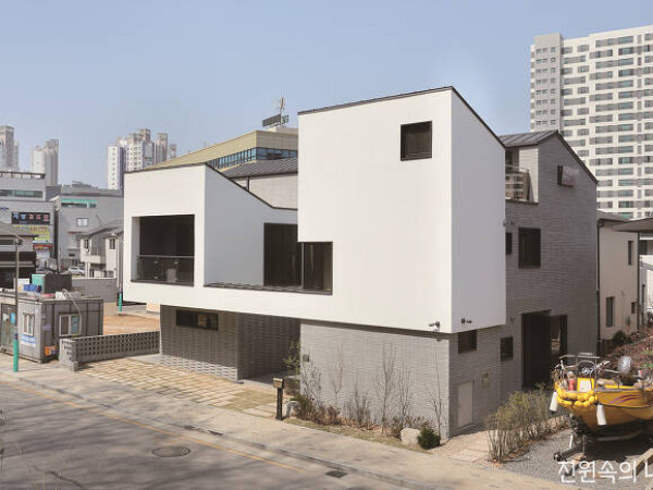 잘 조성된 인천광역시의 한 주택지구. 연로하신 부모님을 모시기 위해 형제가 뜻을 모아 집을 지었다.이미지 크게 보기어릴 때부터 단독주택에서 자라 늘 아파트보다는 주택이 좋았던 형제. 각자 가정을 꾸리며 살던 어느 날, ‘다음 집은 사지 말고 함께 지어보자’라며 농담 반 진담 반으로 했던 대화를 계기로 집짓기라는 꿈을 현실로 옮겼다.이미지 크게 보기1 주택의 측면. 마감재를 달리해 건물 외관에 변화를 주었다.이미지 크게 보기2 현관부. 좌측은 부모님과 큰아들 내외가 거주하는 공간, 한층 더 오르면 작은아들 가족의 공간이 위치한다.총대를 멘 건 형 김주석 씨였다. 예산과 직장과의 거리 등 가족의 필요요건을 종합하여 대지를 정하고, 은평한옥마을부터 분당, 일산, 광교 등 신도시 단독주택단지까지 자세히 둘러보며 설계자를 물색했다. 그렇게 찾은 마음에 드는 집. 인터넷 검색을 통해 설계한 건축사무소의 이름을 어렵게 알아냈고, 바로 연락을 취했다.HOUSE PLAN대지위치▶ 인천광역시 남동구대지면적▶ 260.90㎡ (78.92평) │건물규모▶ 지상 2층거주인원▶ 8명(부모님 + 큰·작은아들 부부 + 손주 2)건축면적▶ 128.77㎡ (38.95평)│연면적▶ 199.62㎡ (60.38평)건폐율▶ 49.36%│용적률▶ 76.51%│주차대수▶ 1대│최고높이▶ 8.75m구조▶ 기초 –철근콘크리트 매트기초 / 지상 – 철근콘크리트단열재▶벽 –100mm 경질우레탄단열재(벽돌), 150mm PF보드단열재(스터코) / 지붕 –150mm 폴리우레탄스프레이폼외부마감재▶ 외벽 –두라스택 와이드벽돌, 스터코플렉스 / 지붕 –컬러강판 접기담장재▶ 두라스택 큐블럭 시리즈│에너지원▶ 도시가스창호재▶ 이건알루미늄 시스템창호 (27.25mm 진공유리)구조설계▶ 태경구조이엔지│시공▶ 건륭건설 서태원 소장 010-3897-5334설계담당▶ 현주기, 유진석, 성기선│설계▶ 지안건축사사무소총공사비▶ 6억원(인테리어 포함, 설계·감리비 및 조경비 제외)INTERIOR SOURCE내부마감재▶ 벽, 천장 –던에드워드 에베레스트 친환경 도장(거실, 계단), GNI 개나리 LOHAS 벽지(방) / 바닥 –이건 원목마루(1층), 이건 강마루 & 포세린 타일(2층)욕실 및 주방 타일▶ 윤현상재 수입 타일│수전 등 욕실기기▶ 아메리칸스탠다드, 대림바스, 로얄토토주방 가구·붙박이장▶ 영림키친바스│조명▶ 공간조명│현관문▶ 알프라임 단열문중문▶ 이건 라움(1층), 영림 YS-12D 유광 골드(2층)│방문▶ 영림도어계단재·난간▶ 멀바우 + 평철 난간│데크재▶ 현무암 정형깔기이미지 크게 보기3 안마당에서 바라본 출입구이미지 크게 보기4 위아래층의 자유로운 공간구조를 위해 철근콘크리트 공법을 선택했다. 건축물의 단열에 신경 써 달라는 건축주의 요구에 내·외부 이중구조로 단열재를 적용하고, 고성능의 창호시스템을 설치하였다.설계를 맡은 지안건축사사무소 성유미 소장은 “여덟 식구가 한 지붕 아래 거주하며 초래될 수 있는 불편함을 최소화하려했다”며 “별도의 출입구를 두는 등 각 세대 간 적절한 공간 분리를 통해 프라이버시를 보장하고, 3代가 모두 즐겁게 살아갈 수 있도록 공용 공간에도 신경 썼다”고 설명했다.SECTION① 현관 ② 창고 ③ 욕실 ④ 서재 ⑤ 침실 ⑥ 거실 ⑦ 주 ⑧ 다용도실 ⑨ 부모님방 ⑩ 앞마당 ⑪ 데크 ⑫ 주차장 ⑬ 방 ⑭ 발코니 ⑮ 다락 옥상데크이미지 크게 보기PLAN이미지 크게 보기(위부터)ATTIC - 64.04㎡│ 2F - 110㎡ │ 1F - 89.62㎡이미 이 동네 여러 차례 집을 지은 건축가의 경험과 매일 현장을 방문하며 집을 살핀 건축주의 수고, 설계도대로 꼼꼼하게 시공한 현장소장의 노력으로 공사는 큰 문제 없이 순조롭게 진행되었고, 5개월이 지나 주택이 그 모습을 드러냈다.SPACE POINT이미지 크게 보기POINT 1다양한 외부공간집에는 쓰임에 따른 다양한 외부공간이 곳곳에 배치되어 있다. 특히 1층 안마당은 가족 모두의 공간으로, 거실 전면창을 통해 한눈에 담긴다.POINT 2넓은 다용도실주방 옆 다용도실은 보조주방과 세탁실, 수납공간의 역할을 함께 한다. 외부로 연결되는 출입문도 설치해 사용자의 편의성을 높였다.POINT 3분리된 계단실주출입구를 통해 들어서면 각 세대의 현관과 연결되는 공용 계단실이 자리한다. 답답하지 않도록 큰 창을 내어 채광과 전망을 동시에 해결했다.이미지 크게 보기5 모던하고 심플한 재료 및 색감으로 통일성을 부여한 1층 내부집은 주변 경관과 일조권을 고려하여 남동향의 직사각형 대지 위에 차분히 앉혀졌다. 외관은 벽돌과 스터코플렉스로 마감했는데, 이는 기존 이웃집들과 잘 어우러지고 유지 관리의 용이함까지 배려한 설계자의 의도가 엿보이는 부분이다.내부는 군더더기 없이 깔끔한 것을 좋아하는 가족의 취향과 연로하신 부모님의 편의를 위한 요소들이 고스란히 반영되었다.이미지 크게 보기6 큰아들 부부의 방에서 본 서재. 답답하지 않도록 유리 슬라이딩 도어를 두고, 현관 앞 긴 복도에도 넓은 창을 내어 탁 트인 시야를 확보했다.이미지 크게 보기7 오픈형으로 설계한 거실과 주방 모습1층은 안마당을 향해 열린 거실 및 주방 등 공동 공간을 중심으로, 큰아들 내외와 부모님의 공간을 각각 양쪽으로 나눠 배치했다. 특히 거실과 주방