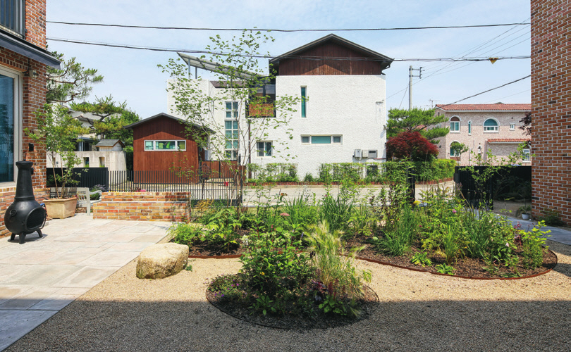 좁은 면적에 정원을 조성할 때, 전형적으로는 벽면 혹은 가장자리에 정원을 두지만 이 집은 오히려 마당의 중앙에 정원 공간을 배치하여 평범하지 않고 독특한 정원 디자인을 완성했다. 우선 주택 높이에 맞추어져 있었던 정원의 지면을 도로면에 맞게 낮추었고, 중앙에 심겨있던 큰 규모의 소나무와 베롱나무를 바깥쪽으로 옮겼다. 바깥쪽 공간들을 활용하기 위해 건물을 따라 벽돌 화단, 벤치, 계단 등의 기능적인 공간들을 만들었다. 중앙 정원은 유연한 곡선을 활용한 부정형의 아메바 구조로, 바라보는 위치에 따라 곡면의 형태와 식물의 배치가 다르게 보여 지루하지 않다. 한 쪽 코너에는 지붕이 없는 휴식공간인 파티오를 조성해 테이블 등을 두어 야외 활동이 가능한 공간을 만들었다. 나무로 된 데크를 주로 사용하지만, 사후 관리가 용이하고 색감이 좋은 석재나 시멘트를 사용해 색다른 분위기를 냈다. 활기찬 여름 밤의 파티도, 난로를 피우고 즐기는 낭만적인 겨울 파티도 모두 어울리는 파티 정원이 탄생했다.