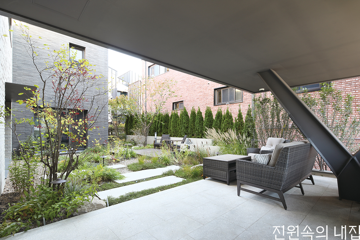 담장 없이 최소한의 조경만을 가진 채 이웃을 향해 열린 중정. 가족의 프라이버시는 지키면서도 방마다 빛을 들여 따뜻한 집을 만드는 요소다. 또한 집 안에서의 풍경을 담장이 아닌 이웃과 동네로까지 확장시킨다. 열린 마당을 위해 건물 일부가 필로티 구조로 들어 올려지며 휴식을 위한 공간이 됐다. 정원이 가진 자연의 정취를 최대한 살리기 위해 흙의 물성에 가까운 벽돌로 꾸민 것 또한 중요한 요소.