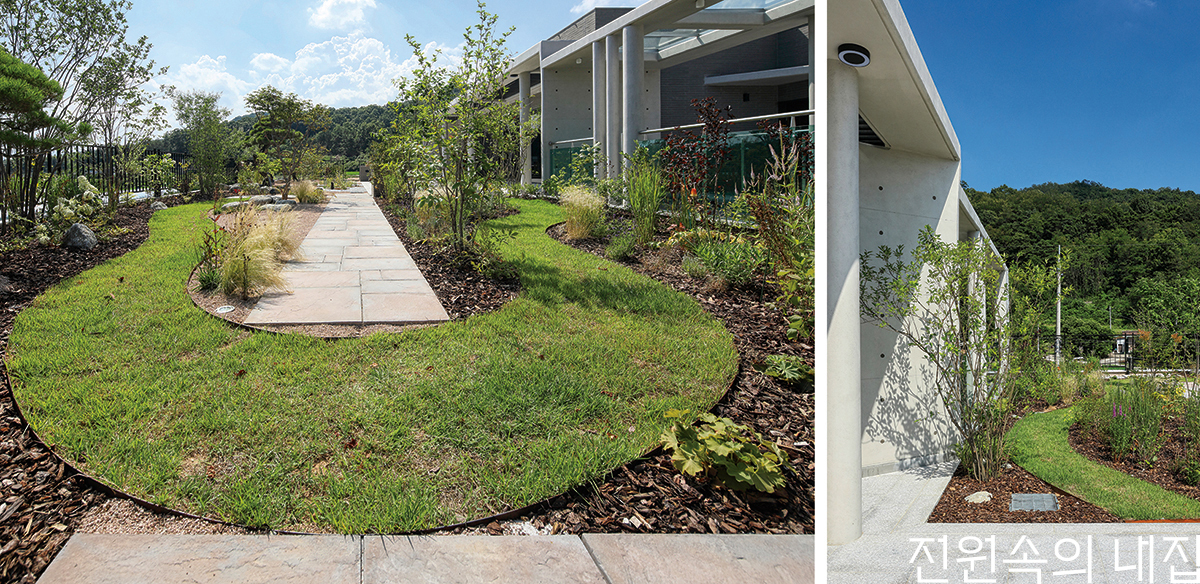 눈코 뜰 새 없이 바빴던 일상에 느림의 여유가 찾아왔다. 새벽이면 새소리에 잠이 깨어 정원으로 나오게 된다는 정원주. 시간이 가는 줄 모르고 다채로운 정원의 모습을 감상하다보니 최근 들어 출근 시간이 계속해서 늦어질 정도라고 한다. 경상북도 성주군에서 개인 갤러리 ‘아트리움 모리’를 운영하는 구복순 대표는 아파트 생활을 마치고 처음 주택에 살게 되면서 나만의 정원에 대한 로망을 실현했다. 긴 직사각형 형태의 정원은 크게 두 개의 테마로 이루어져 있다. 처음 정원에는 노송 두 그루가 심겨져 있었는데, 한옥식으로 꾸민 집 내부와 어울리는 풍경이었기에 기존 소나무를 그대로 두고 동양식 정원을 꾸미기로 했다. 나머지 절반 정도의 땅에는 유럽식 정원을 설계했다. 모던하고 깔끔한 외관과 정원 쪽으로 열린 테라스 공간에 설치된 원통형 기둥은 웅장하면서도 새로운 정원과 조화를 이룬다.