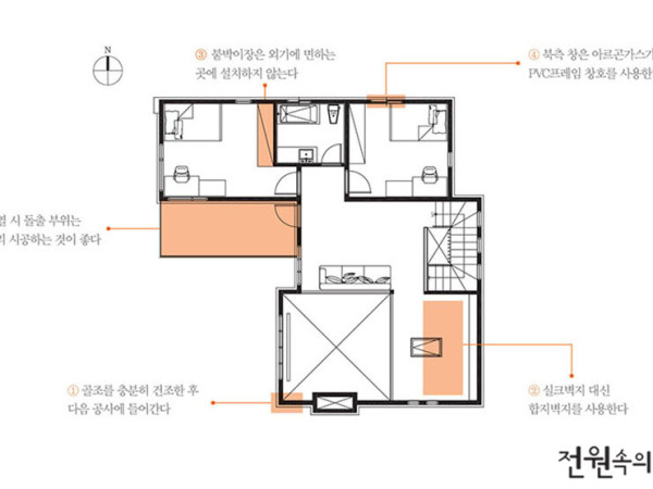 공동주택의 경우, 결로 취약 부위에 대한 결로 방지 상세도를 작성해서 설계도서에 포함해야 하지만 단독주택은 그러한 법규가 없다. 주택에서 하자 문제로 가장 골치 아픈 결로와 곰팡이를 원천적으로 차단하기 위한, 다섯 가지 가이드라인을 제시해본다. 취재 정사은 ① 골조를 충분히 건조한 후 다음 공사에 들어간다아파트와 같은 공동주택의 골조가 올라간 뒤에 한참 동안 그대로 방치되고 있는 모습을 본 적이 있을 것이다. 수분을 머금고 있는 콘크리트 구조체를 충분히 건조하는 과정이다. 콘크리트가 머금은 습기는 벽체에서, 바닥에서, 슬래브에서 배어 나오기 때문에 골조를 충분히 건조한 후 단열재를 설치하고, 방습층을 설치하는 게 좋다. 마루 공사 역시 바닥 보일러를 깔기 위해 친 방통의 콘크리트가 완전히 마른 후 바닥재를 까는 것이 습기를 바닥에 가두지 않는 방법이다. 콘크리트 구조체로 지어지는 단독주택도 골조의 건조 작업은 가장 기본이다. 목조주택 역시 구조재로 사용한 구조목의 함수율을 미리 점검해 19% 이하일 경우에 다음 공정으로 넘어가는 것이 좋다.▲ 콘크리트 구조체 습기를 충분히 말리는 모습(상)과 나무의 함수율을 측정하는 도구(하)② 실크벽지 대신 합지벽지를 사용한다실크벽지라는 이름의 ‘합성수지벽지’를 시공하면, 벽체와 벽지 사이에 곰팡이가 생기더라도 건축주가 이를 깨닫는 데 걸리는 시간이 한참이다. 벽지 위로 곰팡이가 올라오고 난 뒤에는 이미 결로수가 벽을 타고 흘러내려 바닥까지 번진 후이고, 이미 건강을 해치고도 남을 수준의 곰팡이 포자가 잔뜩 자라있을 시점이다. 그래서 패시브하우스처럼 쾌적한 건축환경을 추구하는 건축물에서는 벽체가 숨을 쉴 공극이 거의 없는 실크벽지의 사용을 지양하고 있다. 콘크리트 주택뿐 아니라 목조주택에서도 실크벽지의 사용은 될 수 있으면 자제하는 편이 좋다. 나무가 숨을 쉰다는 이유로 목조주택을 지어놓고는 실크벽지로 이 숨통을 틀어막는 격이기 때문이다. 외부에 투습방수지 처리를 하고 레인스크린을 설치해 공기의 대류를 원활히 한다고 해도, 내부에서 실크벽지 마감을 하면 숨통을 막고 있는 거나 다름 없다. 최근에는 다양한 디자인과 컬러의 합지벽지도 많이 출시되고 있어 건축주 선택의 폭도 넓어졌다.③ 붙박이장은 외기에 면하는 곳에 설치하지 않는다 구조체를 기밀하게 시공하고, 방습층을 꼼꼼하게 처리했다고 하더라도 외기와 면한 벽체에 붙박이장이 들어가는 경우를 조심하자. 대기업에서 분양하는 아파트의 카탈로그를 자세히 보면 외기와 면한 쪽에는 붙박이장이 설치되어 있지 않은 것을 알 수 있다.붙박이장을 외벽 쪽에 붙여서 설치하면, 붙박이장과 실내 공기 사이에 하나의 층이 생겨 오히려 곰팡이를 만드는 최적의 조건이 될 수 있다. 이 공기층은 환기를 시켜도 잘 움직이지 않고 정지된 상태로 존재하는데, 이 층이 강하게 열저항 역할을 해 공기를 따뜻하게 데우지만, 그만큼 구조체의 실내 측 표면 온도를 낮추는 단점이 있기 때문이다. 앞서 언급했듯 실내와 실외 구조체의 표면 온도 차이가 많이 날수록 습기가 생길 가능성이 높아지고, 그만큼 결로와 곰팡이가 생길 위험은 증가한다. ④ 북측 창은 아르곤가스가 충진된 PVC프레임 창호를 사용한다흔히 ‘알미늄 샷시’라고 불리는 알루미늄 창호는 주택에 적용할 때 조심스러워야 한다. 알루미늄은 비닐계 합성수지인 PVC에 비해 열전달이 약 1,500배 잘 되는 재료로, PVC 창호의 열적 성능을 따라가기에는 역부족이다. 물론 초고가의 알루미늄 창호도 있지만, 일반인들이 쉽게 접근할 수준의 금액은 아니다. 특히 하루 종일 햇볕이 들지 않는 북측 창의 경우 알루미늄 창호는 에너지를 뺏기고 온도 차이에 의한 결로수를 만드는 일등 공신이다. 피치 못하게 북측에 창을 내야 할 경우에는 될 수 있는 한 열관류율이 낮은 PVC 창호와 열난방 복사열을 감소시켜 열의 흐름을 억제하는 로이코팅된 2중 혹은 3중 유리, 그리고 그 사이에 비활성기체층으로 열전달을 막는 아르곤가스를 충진한 창호를 사용할 것을 추천한다. ⑤ 외단열 시 돌출 부위는 열적 분리 시공하는 것이 좋다발코니, 옥상 파라펫, 창호 주변으로 발생하는 선형 열교는 필연적으로 에너지 낭비를 부른다. 구조체가 돌출되는 부위의 경우, 튀어나온 부분에서 전달된 열은 내부로 흘러 들어 건물의 모서리와 접합부에 선형 열교를 발생시키고, 구조체 내·외부 온도 차이를 만들어 결로현상을 만들 가능성이 높아진다. 외단열을 채택해 건물을 감싸는 형태의 디자인을 한다면, 이런 돌출부위의 구조를 별도로 구성해 열교의 발생을 원천적으로 차단하는 방법도 고려해볼 만하다. 옥상의 파라펫도 열교가 발생하기 좋은 부분인데, 구조체보다 열전도율이 낮은 재료를 사용해 분리해주는 것이 좋다. ▲ ALC 블록으로 옥상 파라펫을 시공, 열교를 차단한 현장 ● 열교(Heat Bridge)구조체 두께가 얇거나 단열재 누락으로 열저항이 낮아진 부위로 많은 열이 들어오거나 나가는 경로를 말한다. 열교 부위는 단열성이 떨어져 벽체 표면이 노점 이하로 내려가 결로의 원인이 된